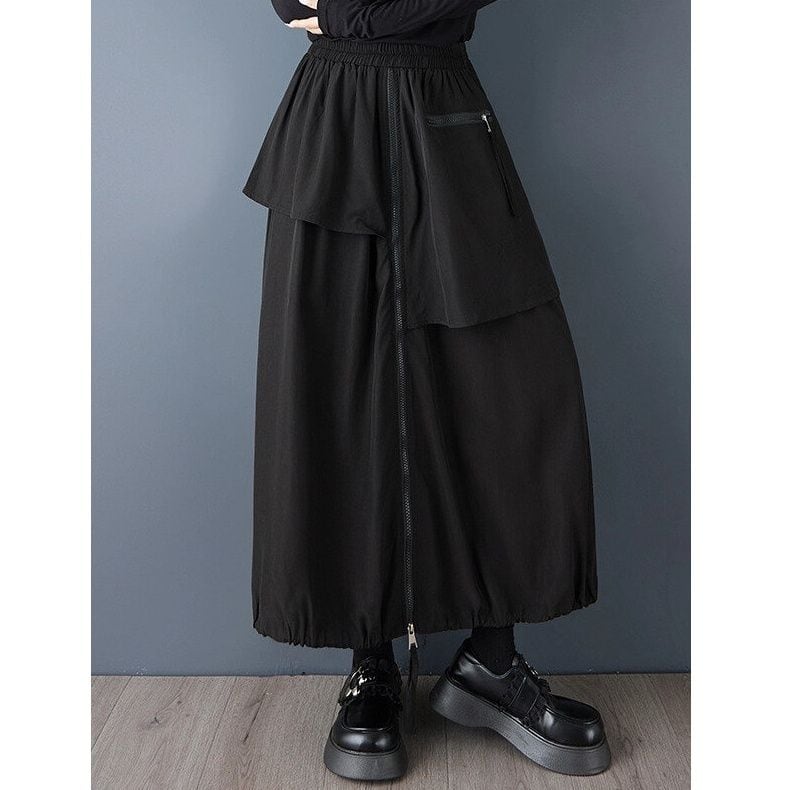 BLACK ASYMMETRIC FLAP FULLZIP A-LINE LONG CASUAL SKIRT 1color M-15359