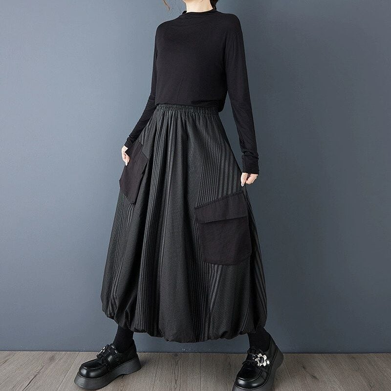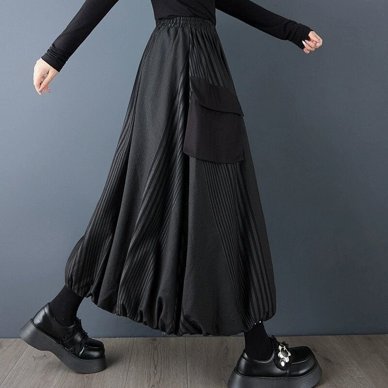 DESIGN STRIPE ELASTIC WAIST A-LINE LONG BALLOON SKIRT 1color M-15360