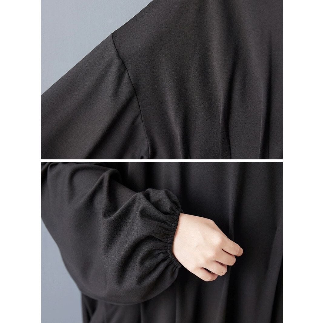 ウエストのプリーツが作り出すシルエットがお洒落な、襟付きチョーカーVネック・長袖・ミニ丈のプルオーバー・シャツワンピースです。オールブラックがクールな印象で、コーディネートしやすいです。バットスリーブのワイド幅がボディラインをカバーする、チュニックとしても使えるアイテムです。