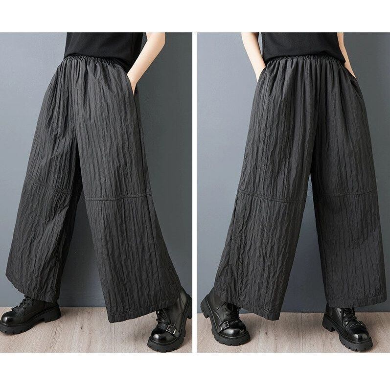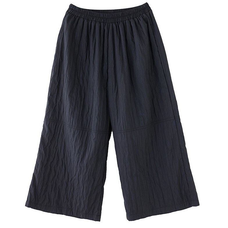 ブラックの薄いキルティング素材でできたワイドレッグパンツのす。ウエストがゴムなので、着脱が簡単で履き心地が良いです。