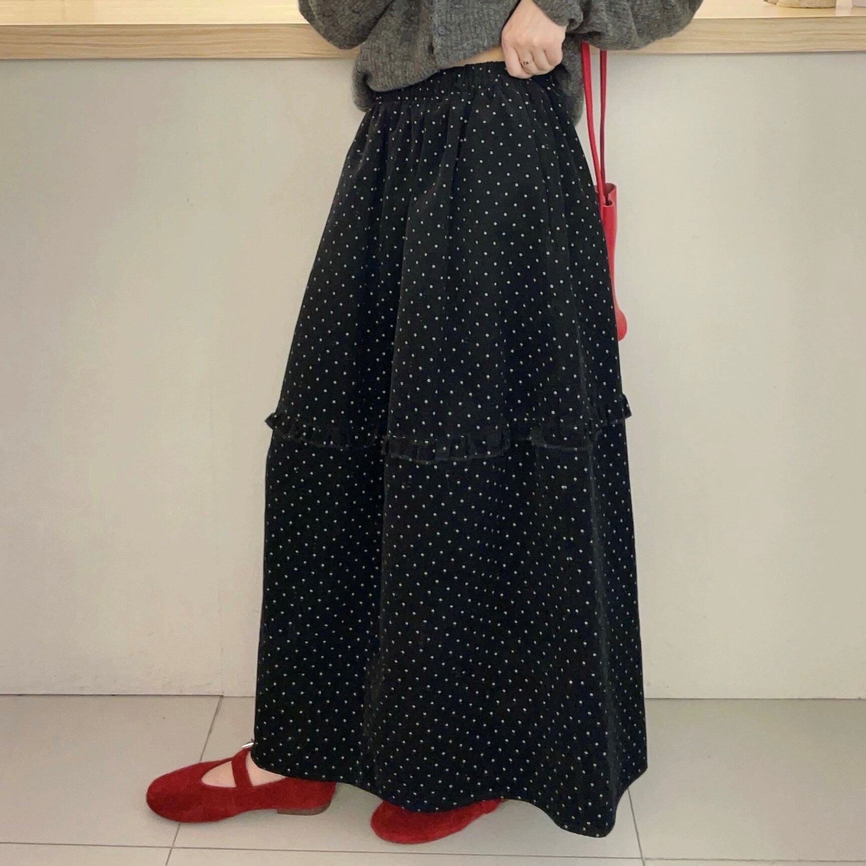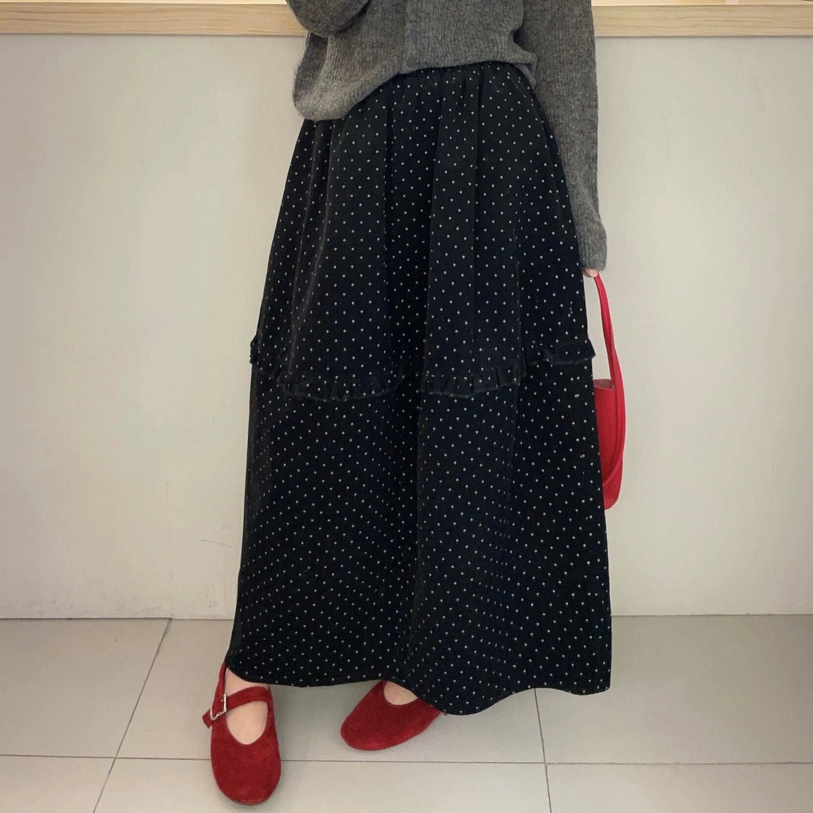 DOT FRILL LINED A-LINE LONG DESIGN SKIRT 1color M-15376
