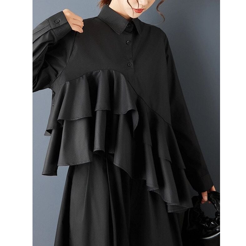 2段フリルのアシンメトリックな裾のラインが美しい、ポロ襟・長袖・イレギュラーヘムのデザインシャツです。ゆったりとしたAラインのシルエットでウエストラインをカバーする、単色で合わせやすいアイテムです。ブラックとホワイトの2色から選べます。