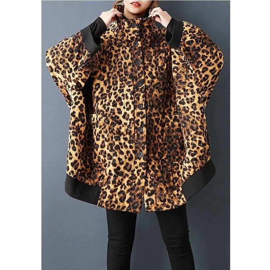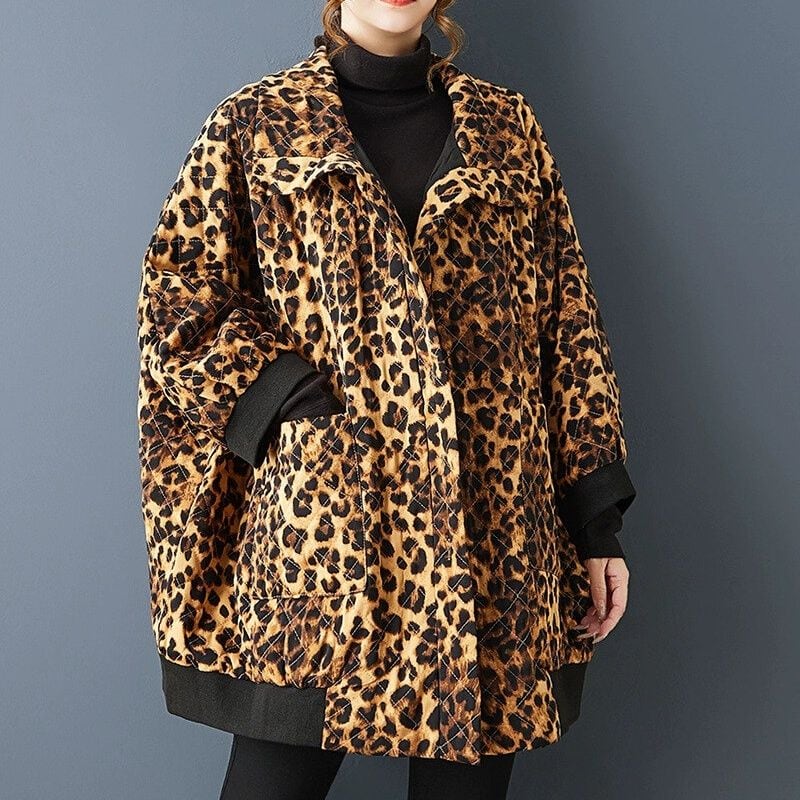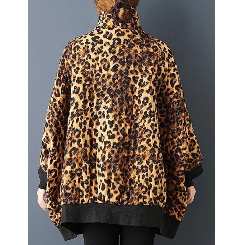 袖口と裾のブラックがアクセントになった、ヒョウ柄のスタンドカラー・8分袖・チュニック丈のキルティングジャケットです。バットスリーブにゆったりとしたワイド幅のシルエットが特徴的な、コーディネートの主役になる目を惹くアイテムです。