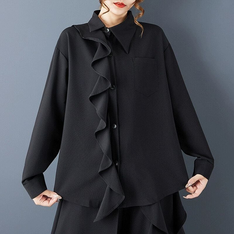 BLACK FRILL TRIMMED SHIRT 1color M-15388