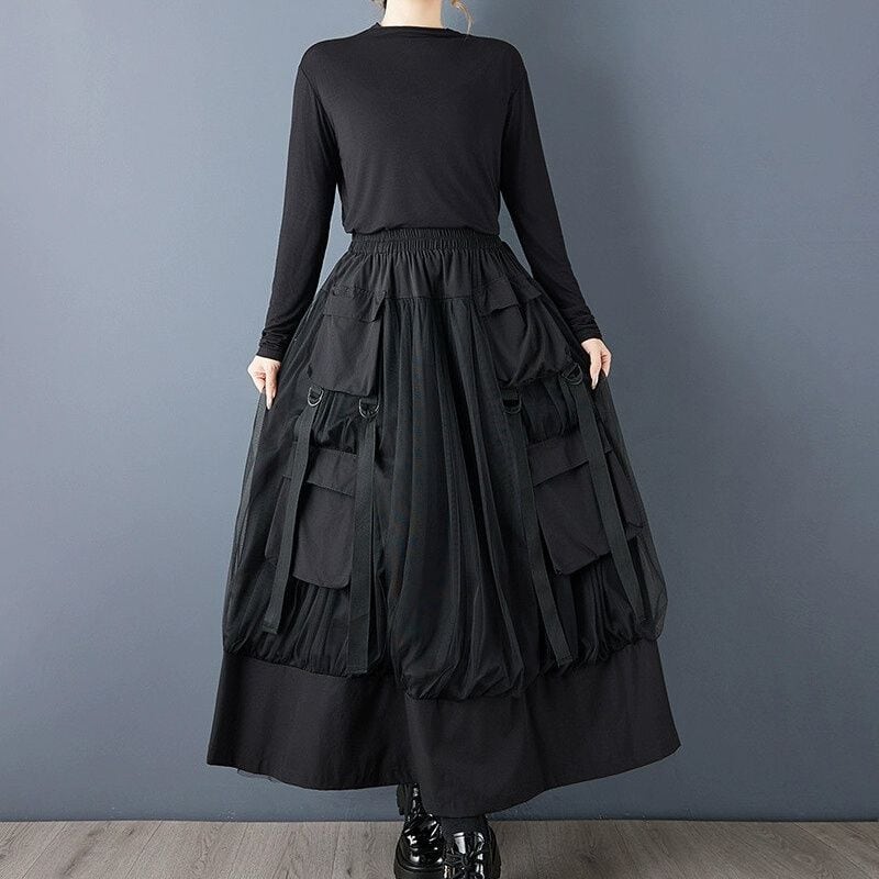 メッシュ素材のスティッチやストラップの付いたフラップポケットが特徴的な、Aライン・ロング丈のデザインスカートです。ウエストはゴムなので、着脱が簡単で履き心地が良いです。フロントとバックで印象の異なる、シルエットの美しいカジュアルアイテムです。ブラックとアーミーグリーンの2色から選べます。