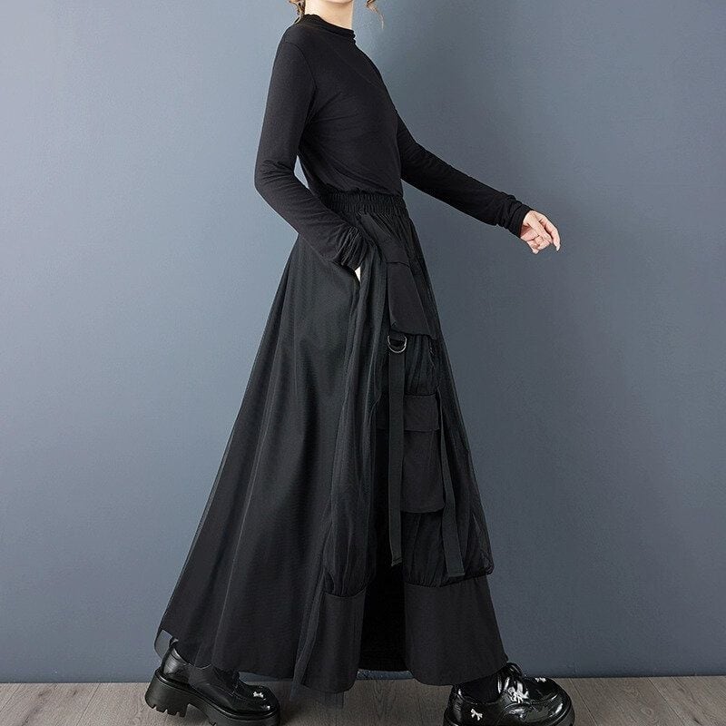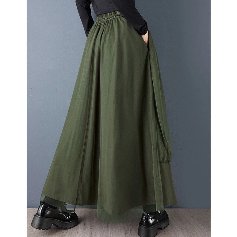 MESH STITCH DESIGN POCKET A-LINE LONG CASUAL SKIRT 2colors M-15390