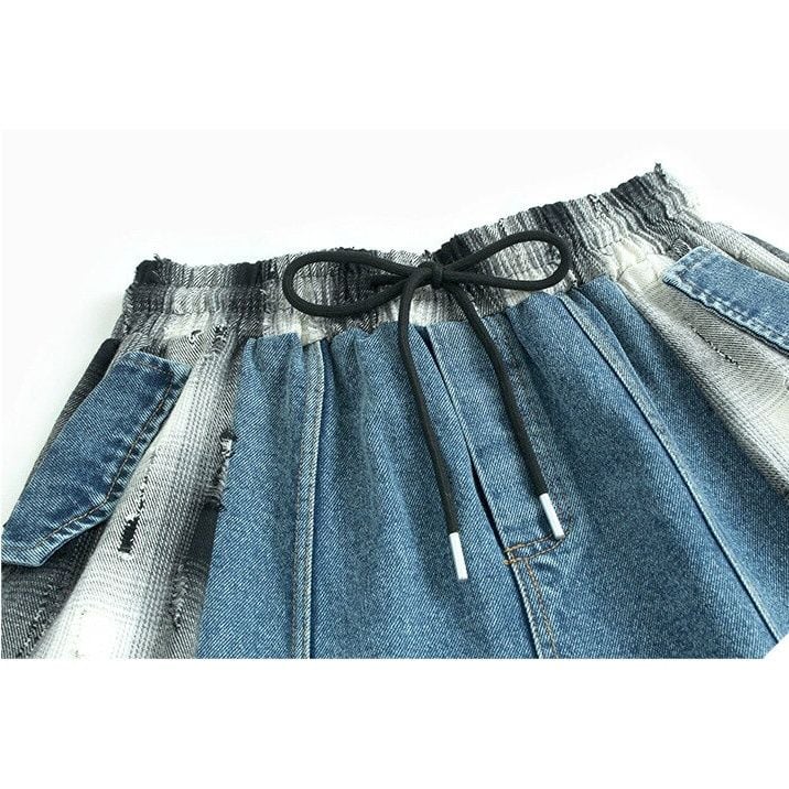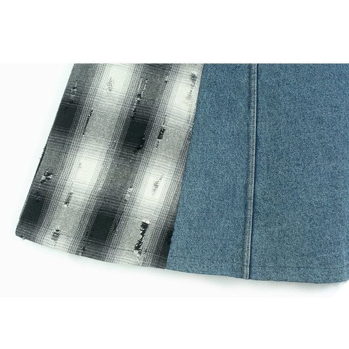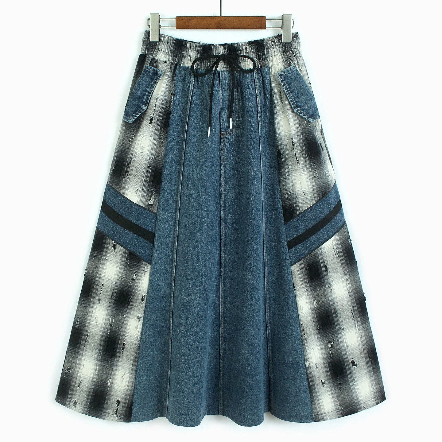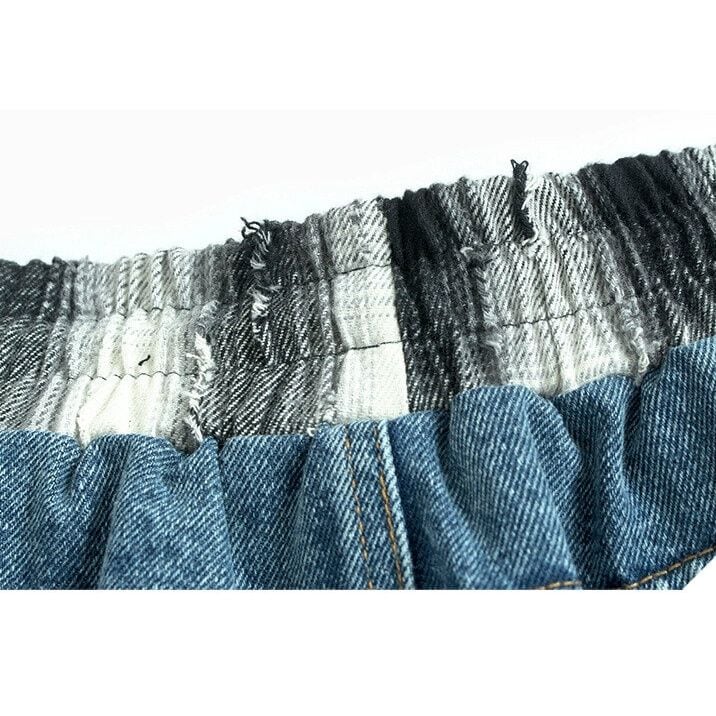 DENIM STITCHED DAMAGED CHECKERED A-LINE LONG SKIRT 3colors M-15400