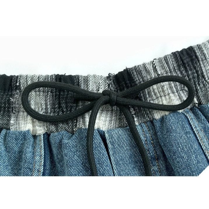デニム素材とダメージ加工が施されたチェック柄生地のスティッチデザインが目を惹く、Aライン・ロング丈のカジュアルスカートです。ウエストはゴム+ドローストリングなので、着脱が簡単で履き心地が良いです。コーディネートの主役になる、レトロな印象のカジュアルアイテムです。色は3色から選べます。