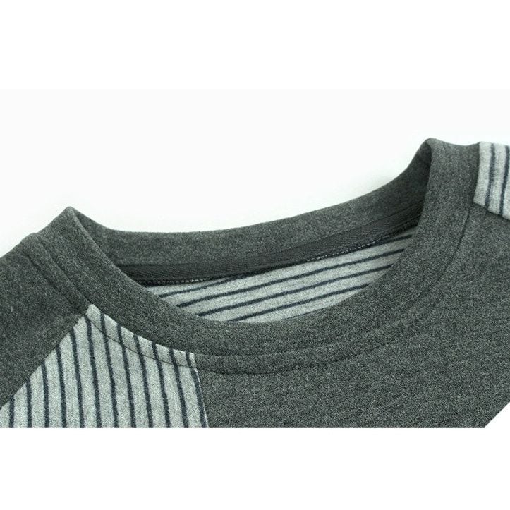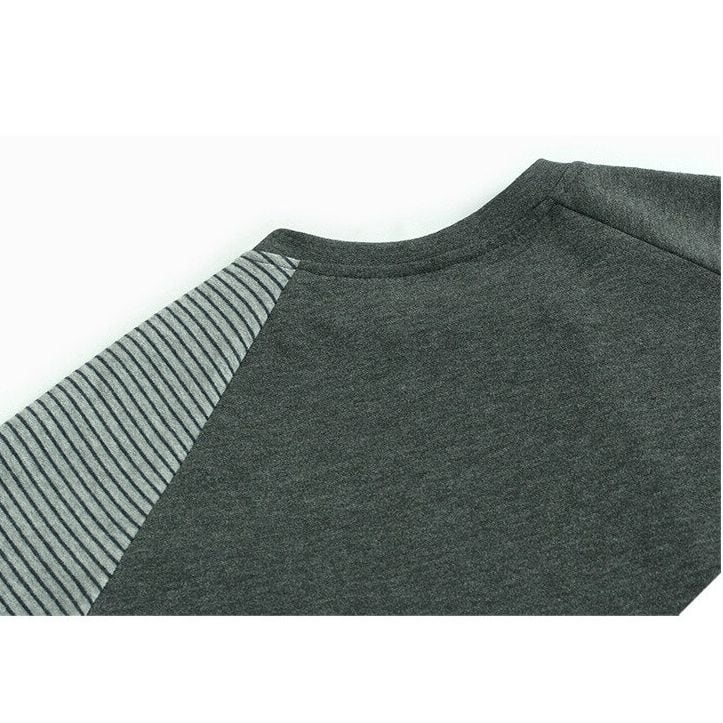 ダークグレーとストライプ生地のブロックスティッチデザインがキュートな、ラウンドネックの長袖Tシャツです。温かみのある厚手の素材でできた、落ち着いた色味で合わせやすいカジュアルなアイテムです。