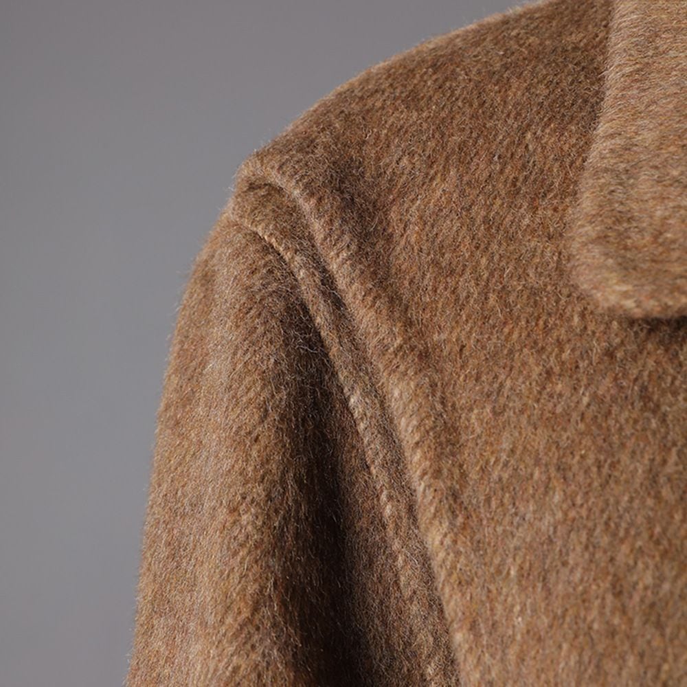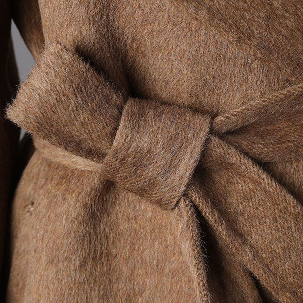 フロント右サイドが二重になったデザインがお洒落な、キャメルブラウンのロング丈・ウールコートです。ウエスト用にストラップベルトが付いたシルエットが美しい、都会的で上品な印象のアイテムです。