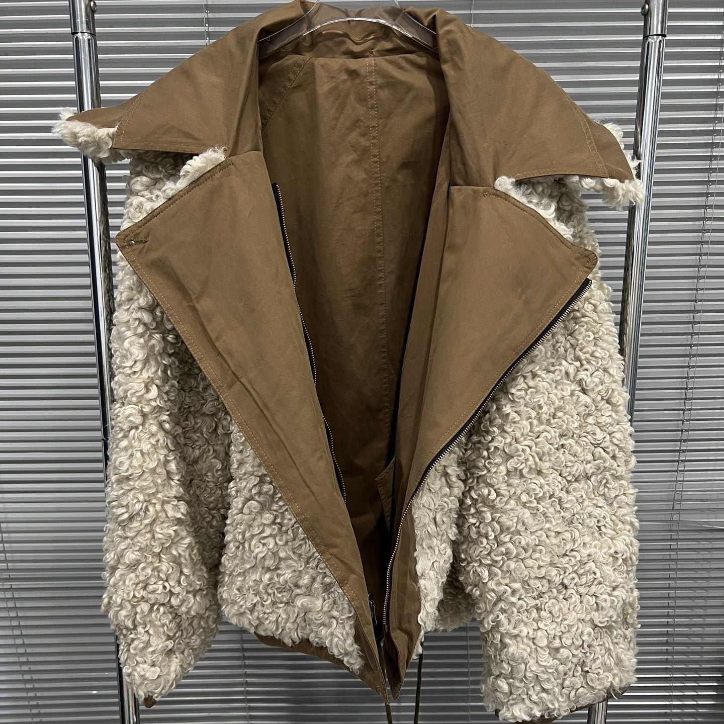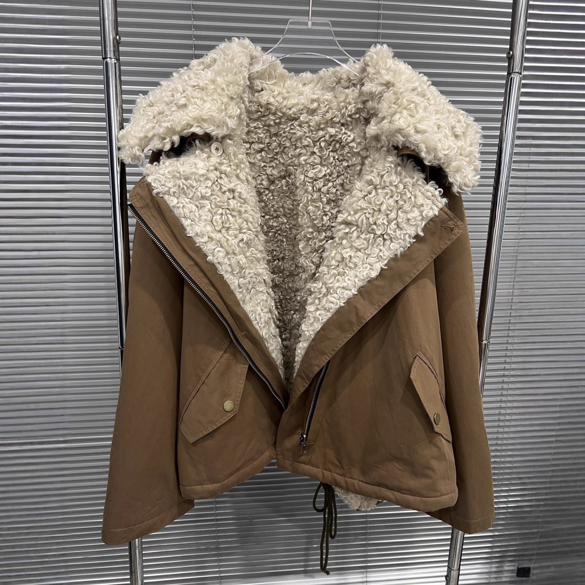羊毛のようなふわふわな素材とブラウンの綿生地のリバーシブルデザインがキュートな、ビッグカラー・長袖・ショート丈のカジュアルジャケットです。裾にドローストリングの付いたフルジップスタイルで、ゆったりとしたシルエットが魅力的なアイテムです。
