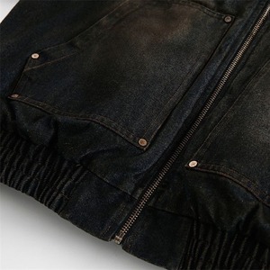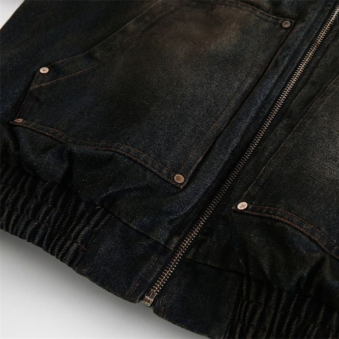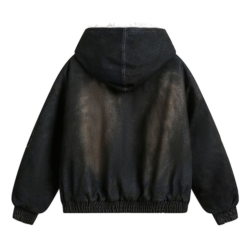 ウォッシュド加工のダークなデニムがクールな、フード付き・長袖・ショート丈のフルジップ・長綿ジャケットです。フードやジップの内側にファーがあしらわれています。袖口や裾がゴム加工された、レトロな印象の防寒アイテムです。
