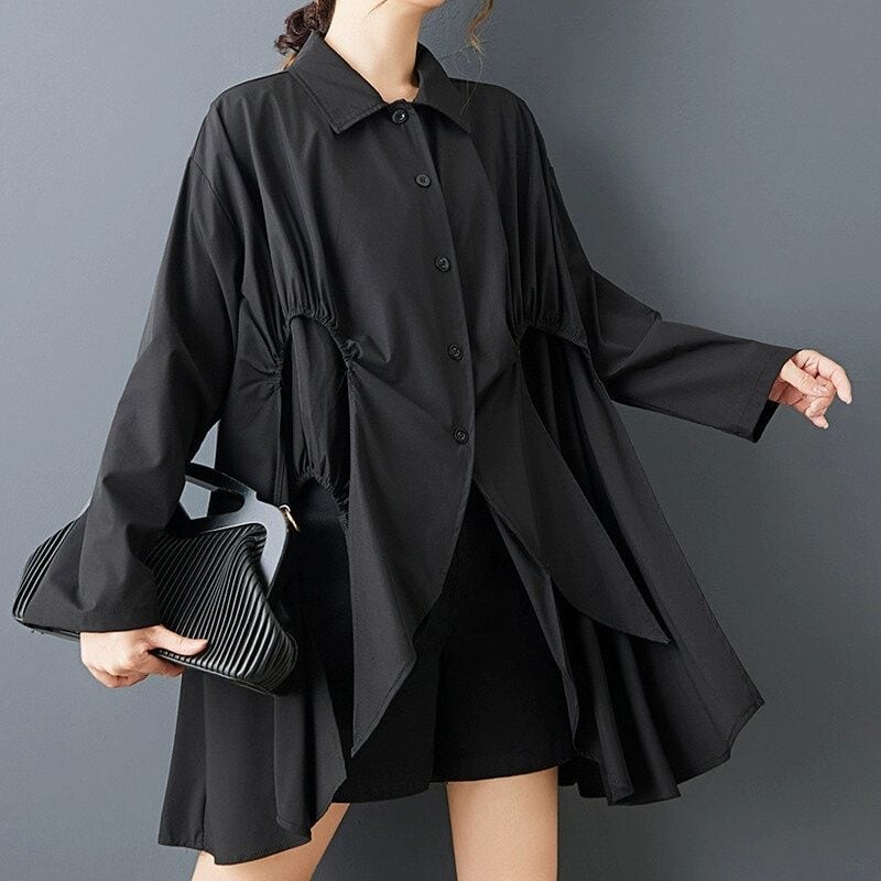 ゴム加工やカットで作られたフロントのシルエットが目を惹く、ポロ襟・長袖・チュニック丈のデザインシャツです。ブラックの単色にAラインシルエットで合わせやすい、コーディネートの主役になるアイテムです。
