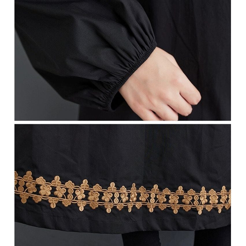 袖と裾に施された刺繍飾りが美しい、ポロ黎・長袖・ロング丈のシャツワンピースです。ゆったりとしたAラインにゴム加工された袖口のシルエットがキュートな、高級感のあるデザインのアイテムです。色はブラックとカーキの2色から選べます。