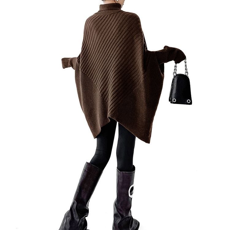 ケープのようなシルエットがお洒落でエレガントな、タートルネック・長袖・チュニック丈のプルオーバーニットです。落ち着いた色味の単色で何にでも合わせやすい、コーディネートの主役になるアイテムです。色はブラックとブラウンの2色から選べます。