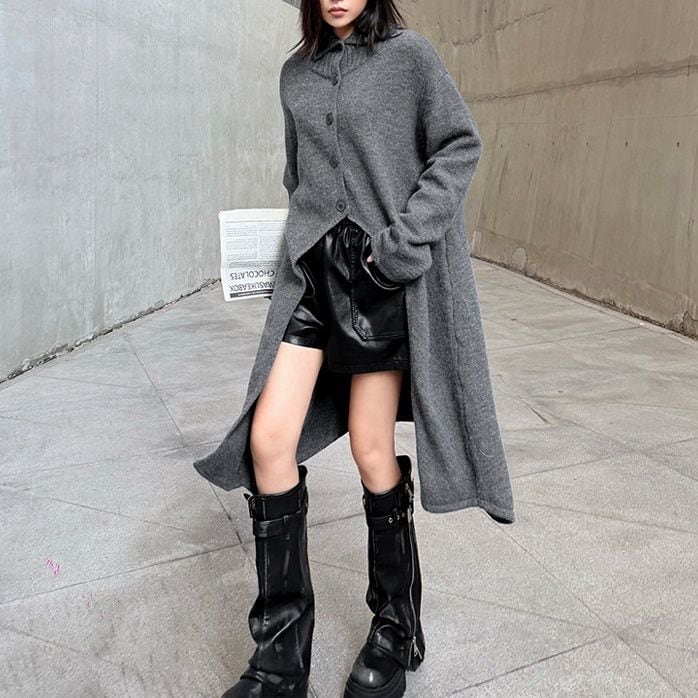 イレギュラーな裾のラインがお洒落な、ハイネック・長袖・ロングラインのニットカーディガンです。ネック部分のリブ加工や大きなボタンがキュートな、単色でシルエットの美しいアイテムです。ブラックとグレーの2色から選べます。