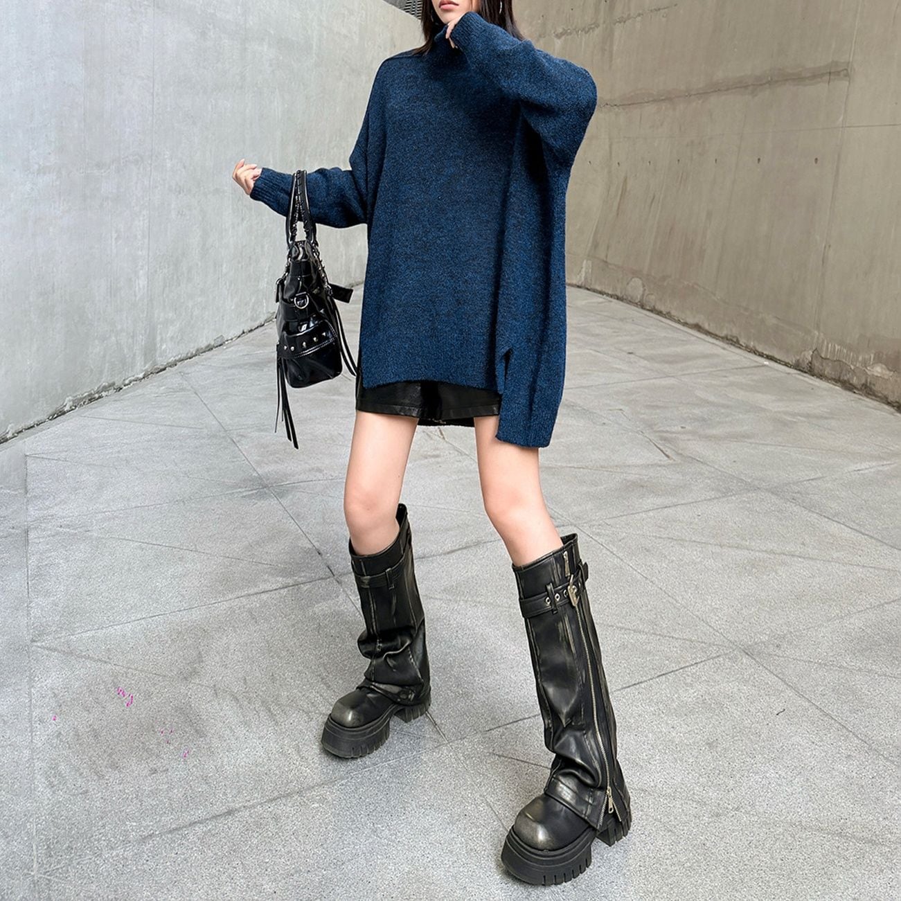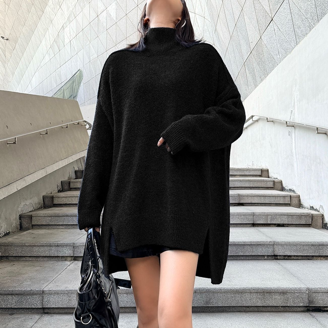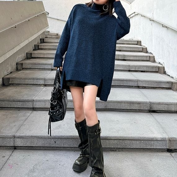 スリットの入ったハイローヘムがお洒落な、ハイネック・長袖・チュニック丈のプルオーバーニットです。単色のゆったりとしたシルエットで、どんなボトムスにも合わせやすいカジュアルアイテムです。ブラックとブルーの2色から選べます。