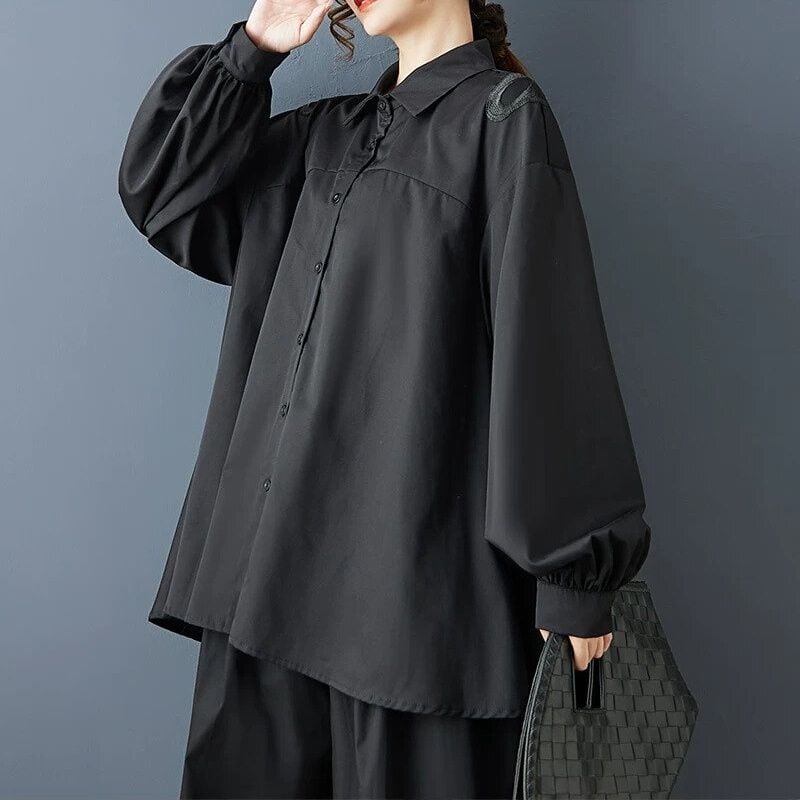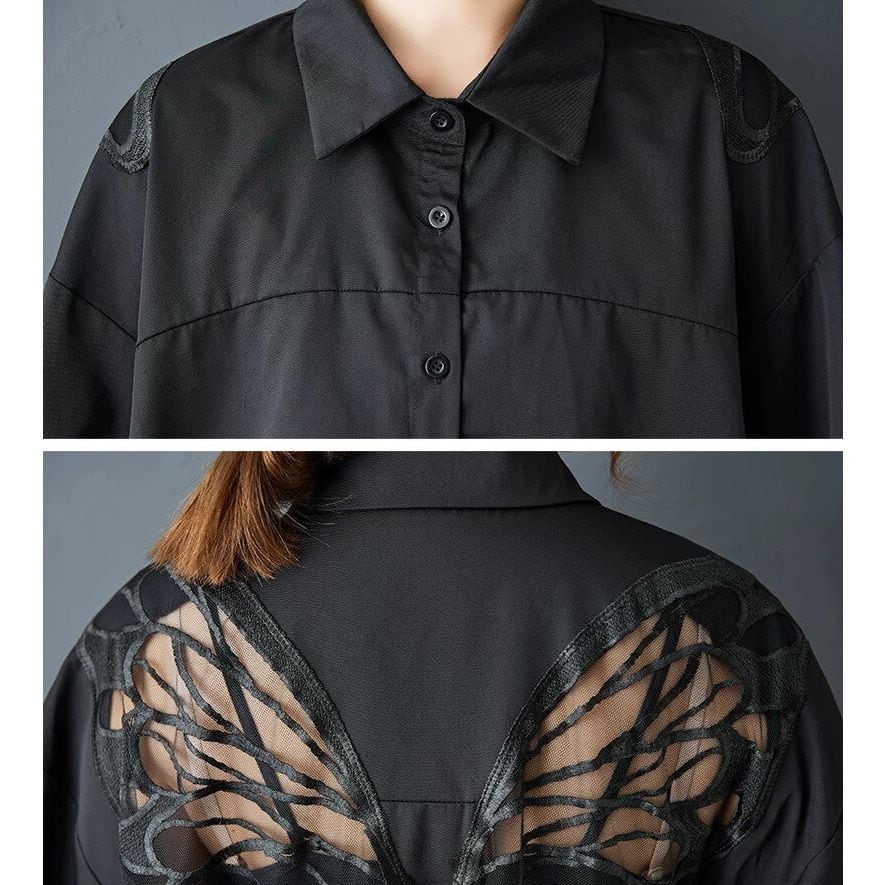 BLACK BATTERFLY MESH STITCHED A-LINE LANTERN SLEEVES SHIRT 1color M-15580