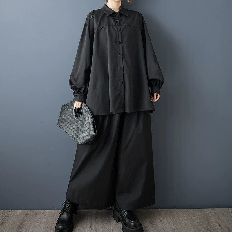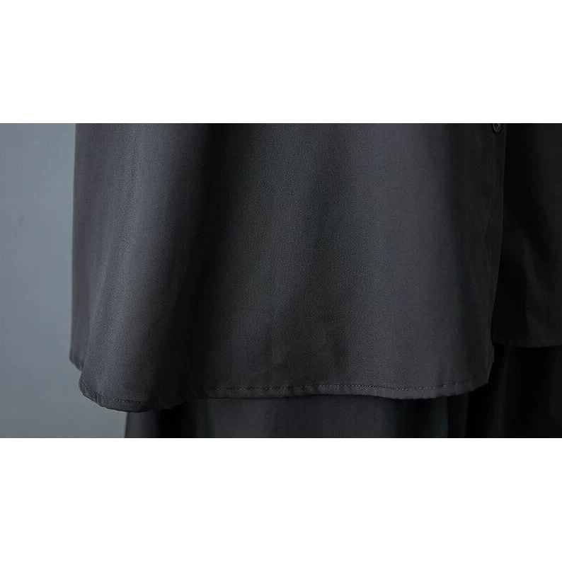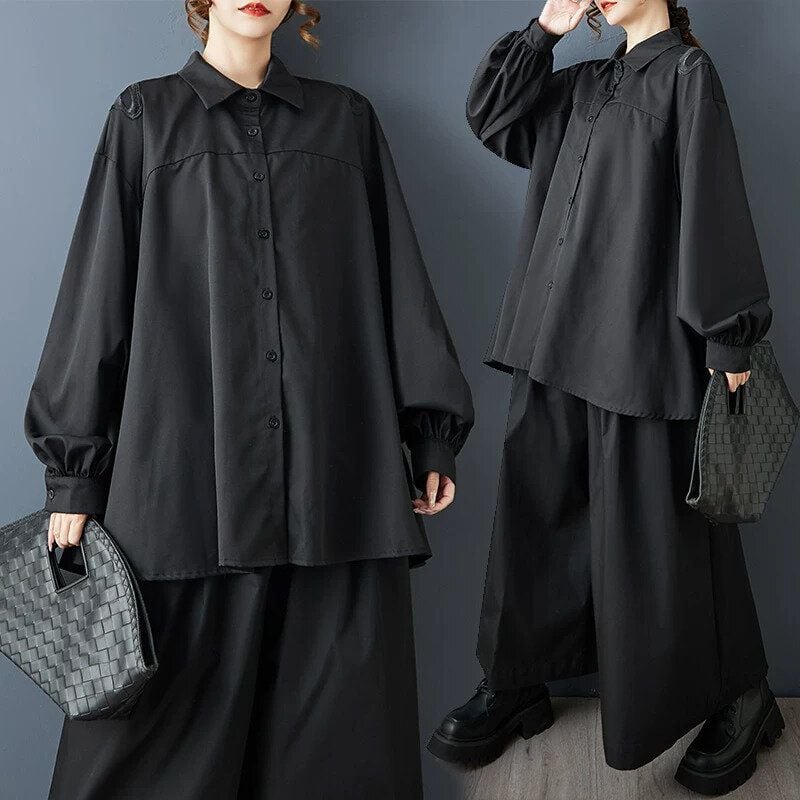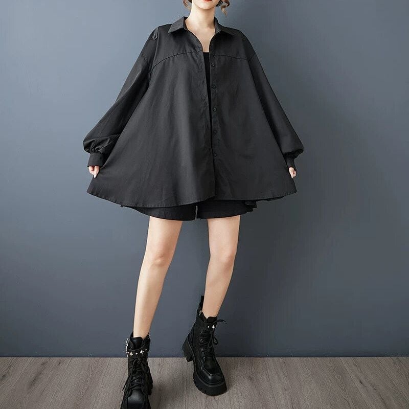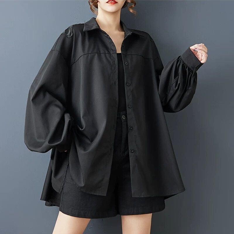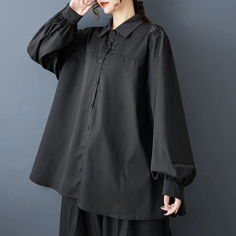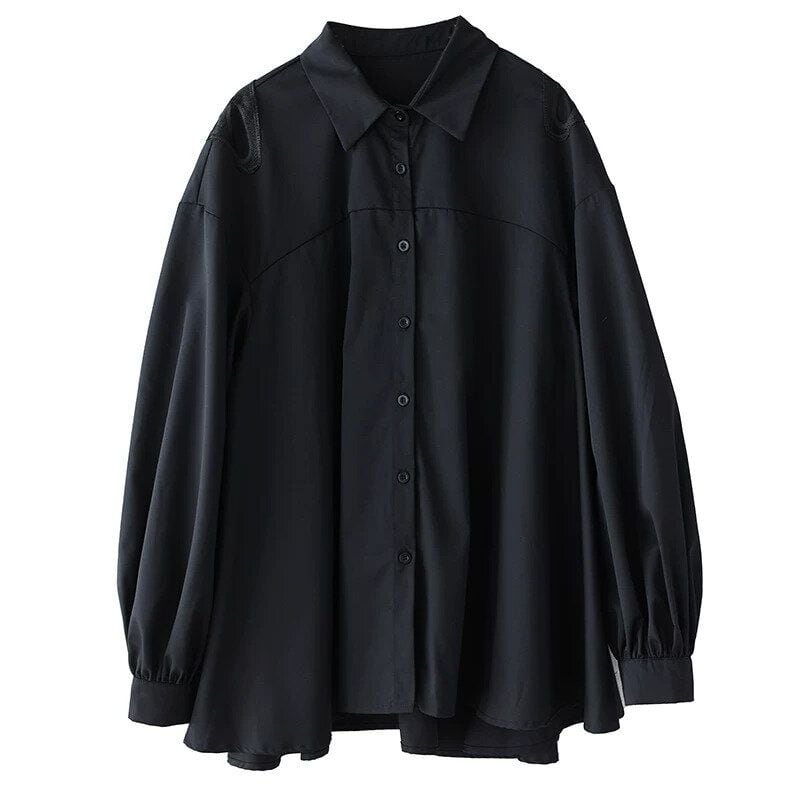 メッシュ素材でできたバックの大きな蝶が目を惹く、ポロ襟・長袖・チュニック丈のデザインシャツです。ランタンスリーブやAラインシルエットのドレープが美しい、ブラックの単色で魅惑的な雰囲気のアイテムです。