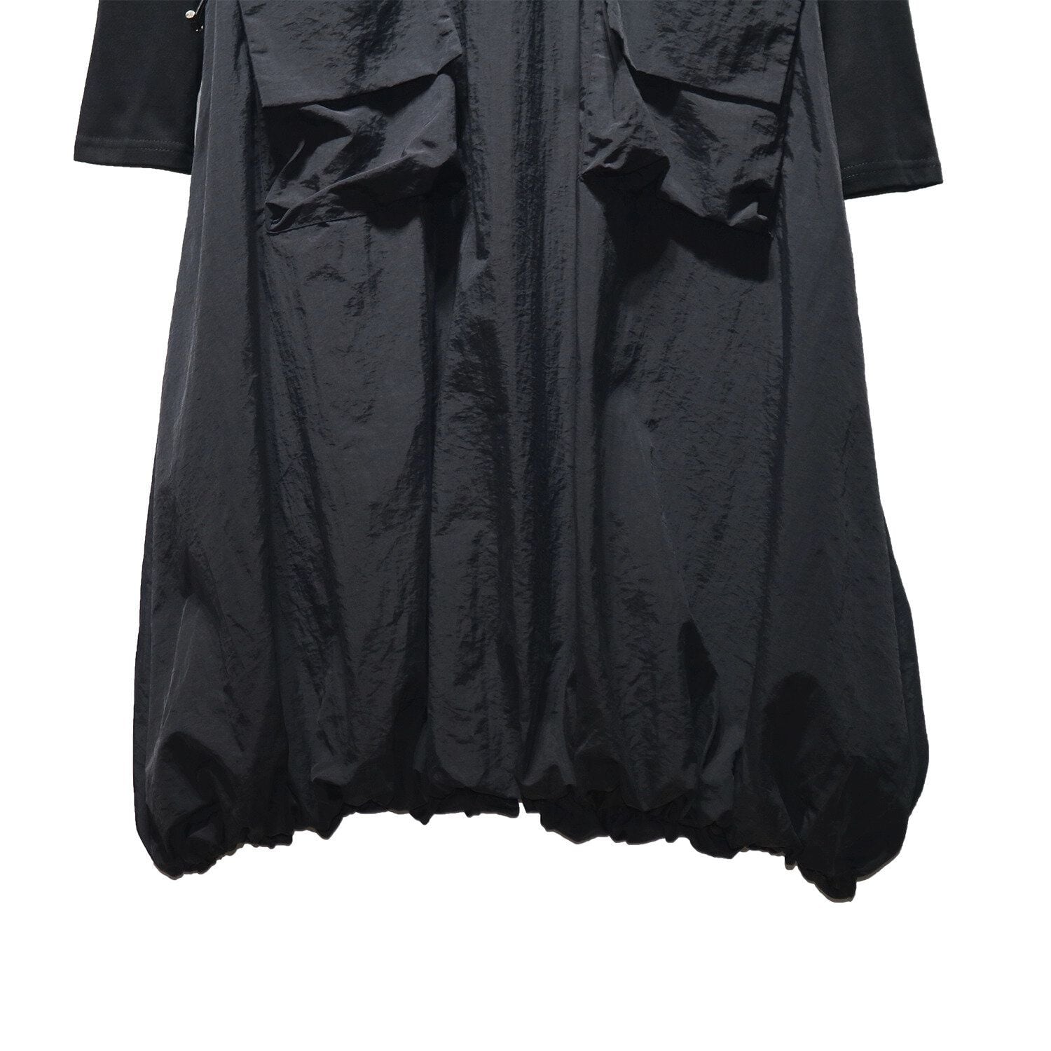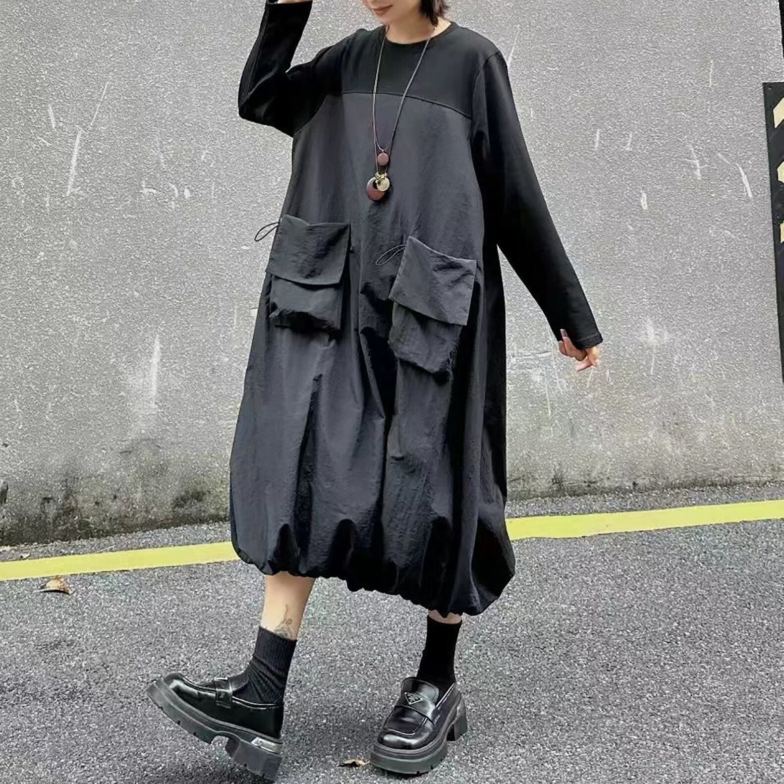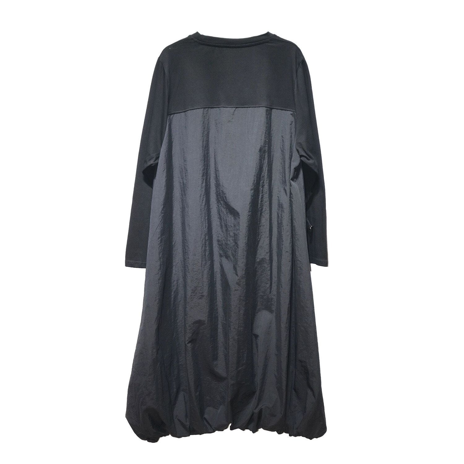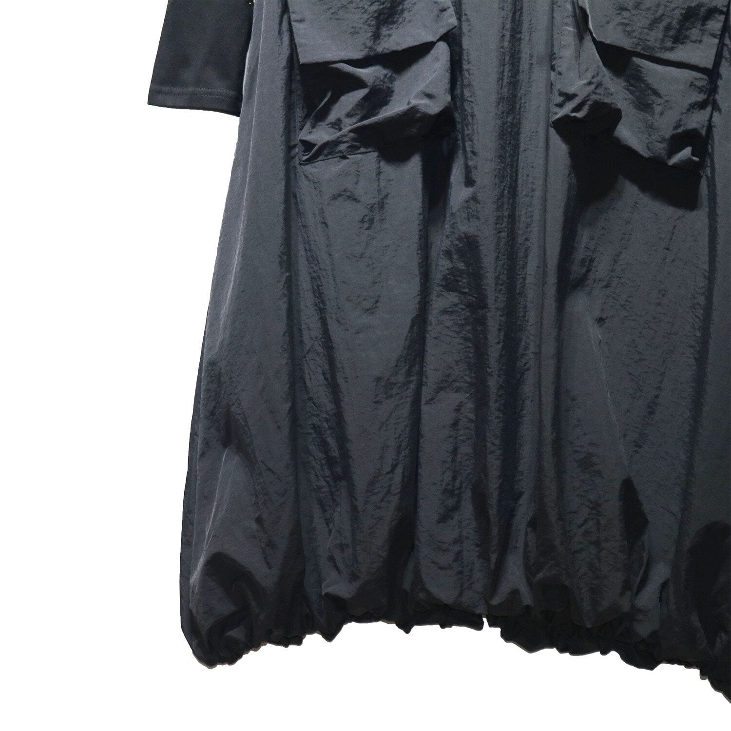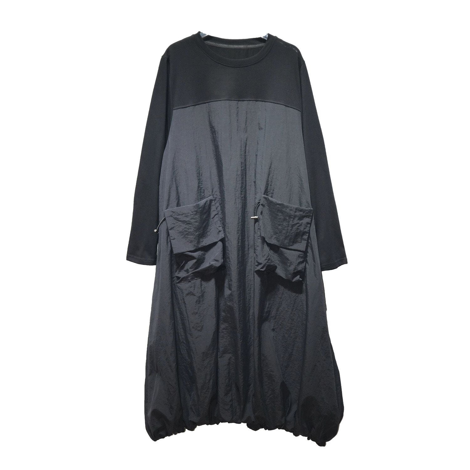 2種類の素材のスティッチデザインがお洒落な、ラウンドネック・長袖・膝下丈のプルオーバーワンピースです。ドローコードの付いたポケットやバルーンのような裾のデザインがキュートな、カジュアルアイテムです。色はブラックとアーミーグリーンの2色から選べます。