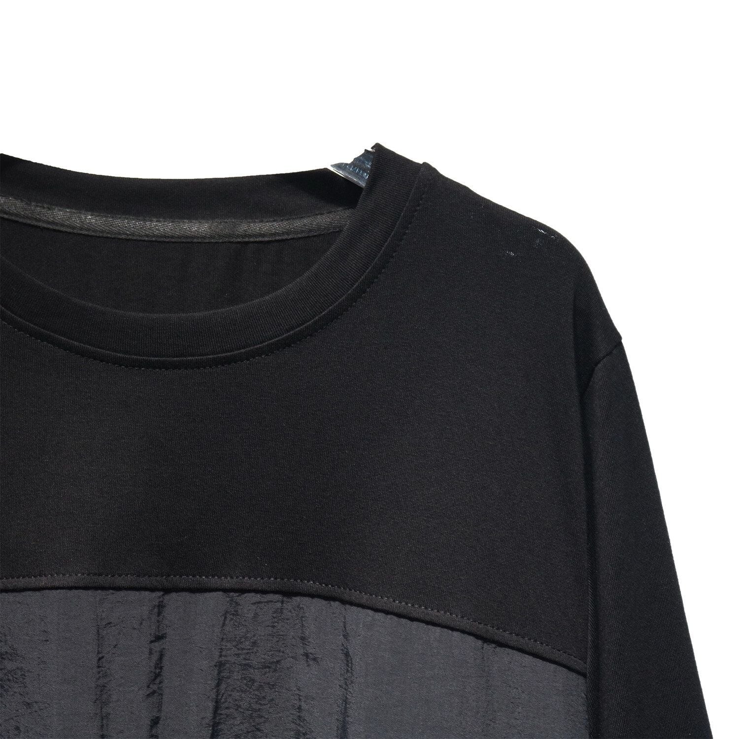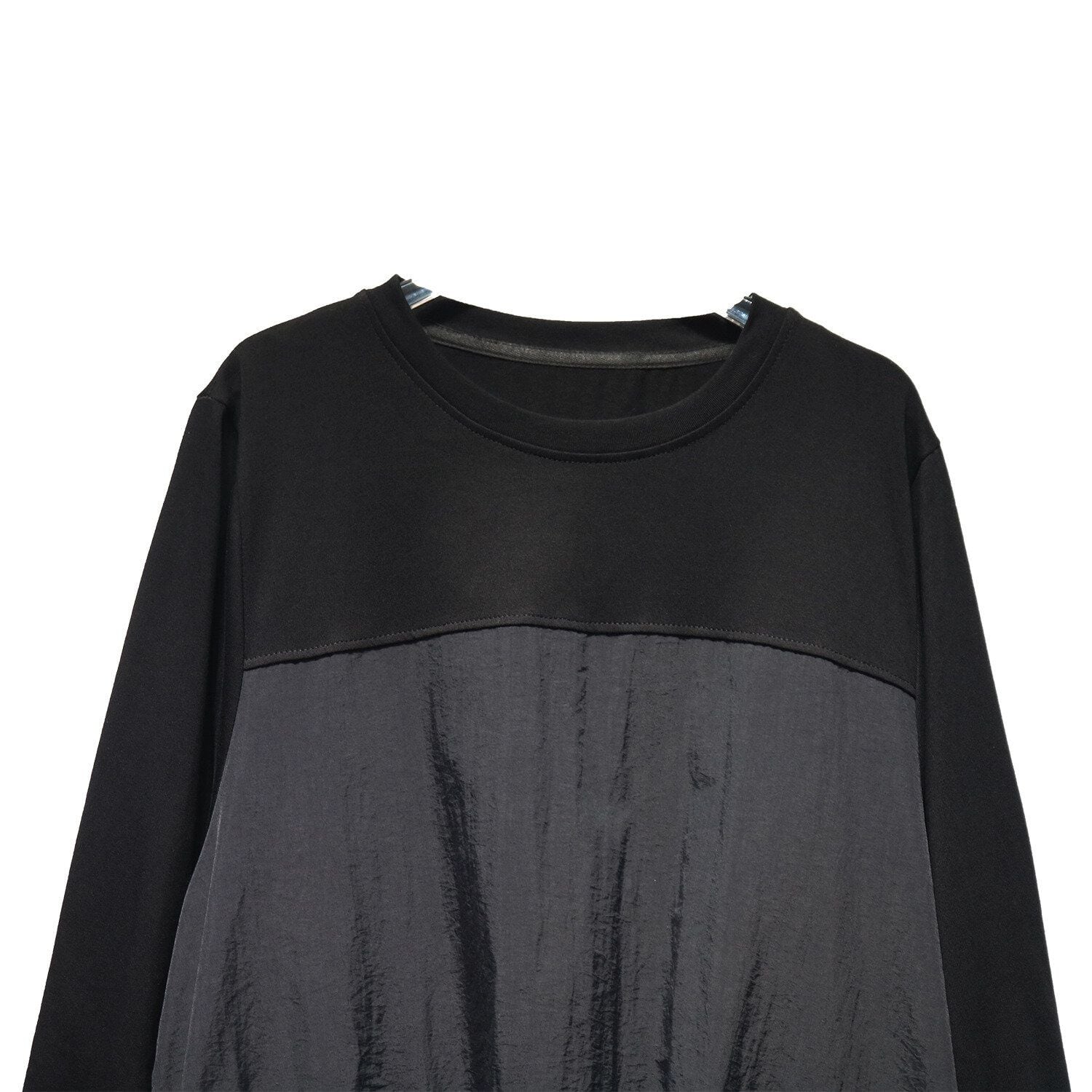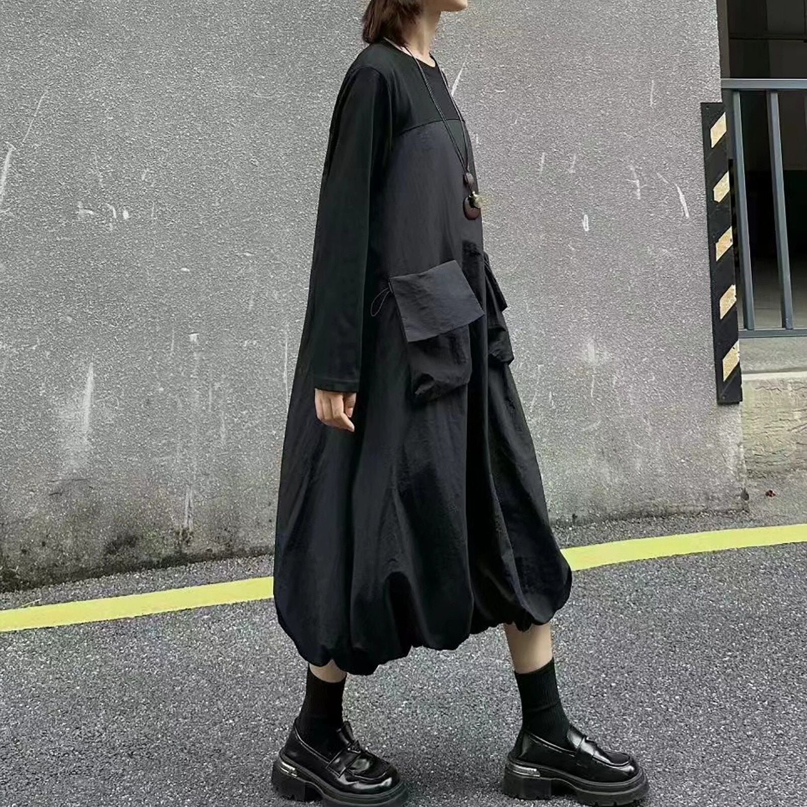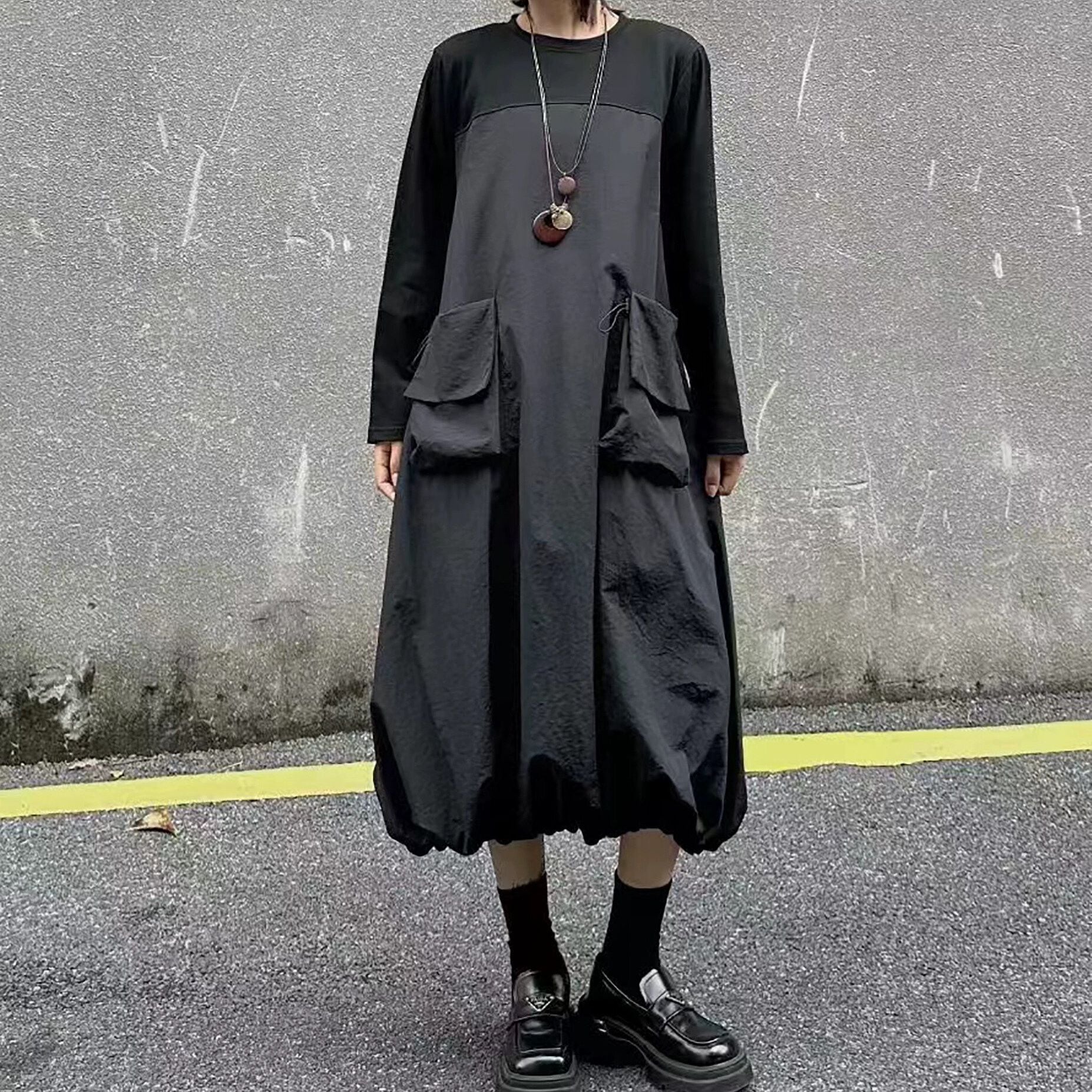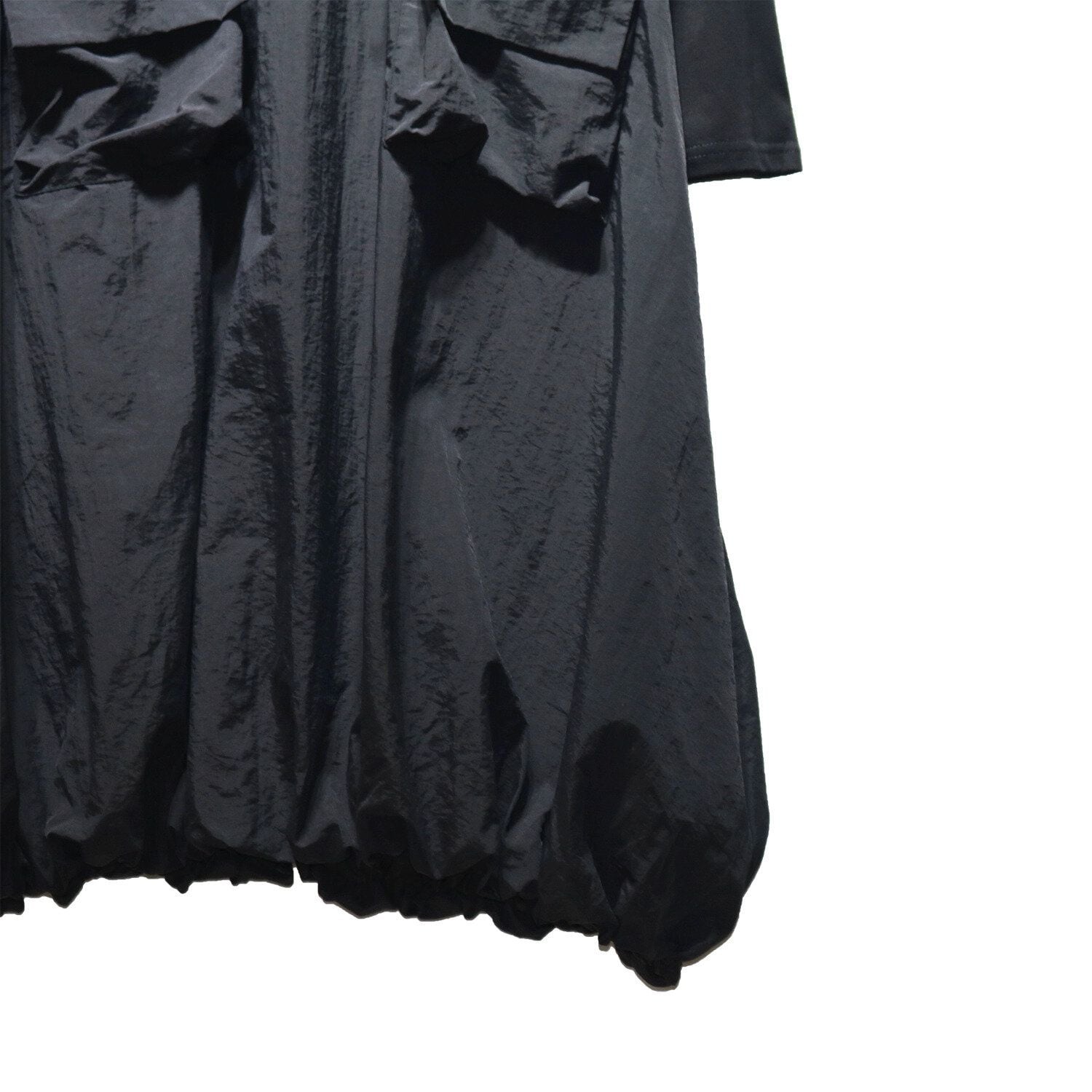 2種類の素材のスティッチデザインがお洒落な、ラウンドネック・長袖・膝下丈のプルオーバーワンピースです。ドローコードの付いたポケットやバルーンのような裾のデザインがキュートな、カジュアルアイテムです。色はブラックとアーミーグリーンの2色から選べます。
