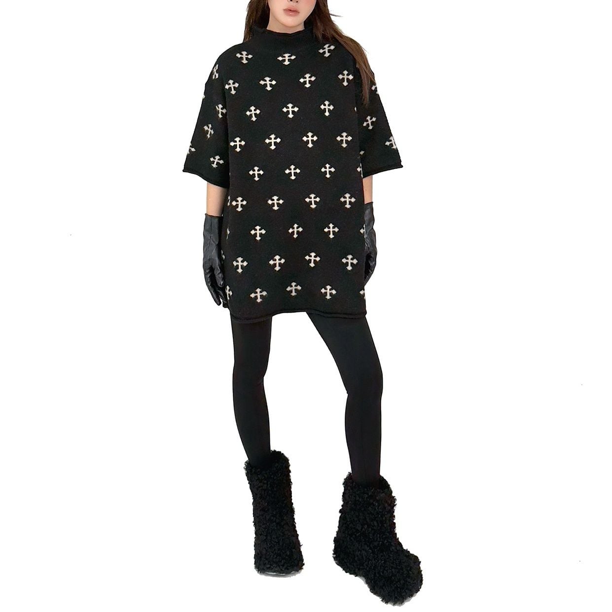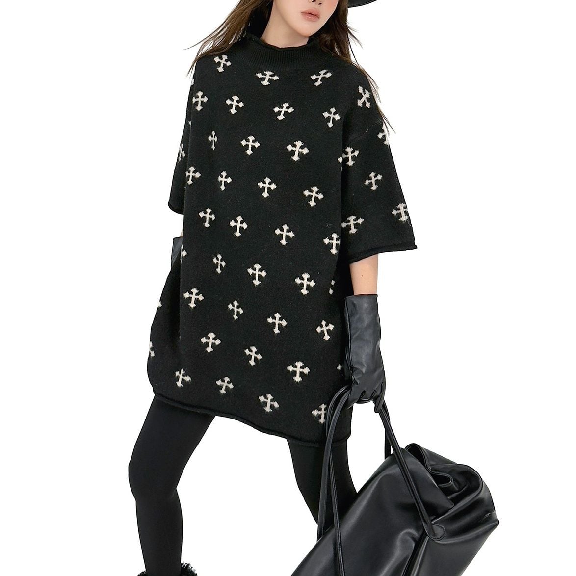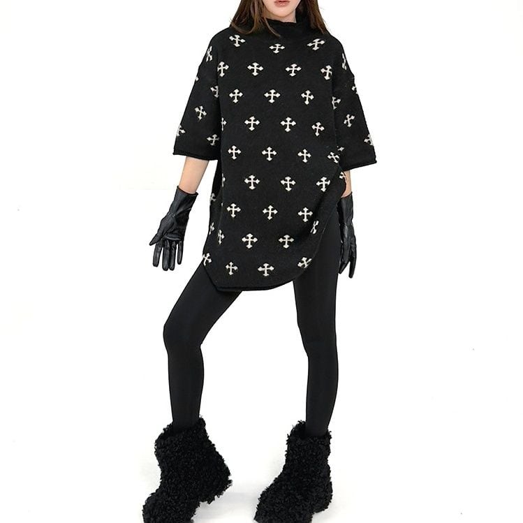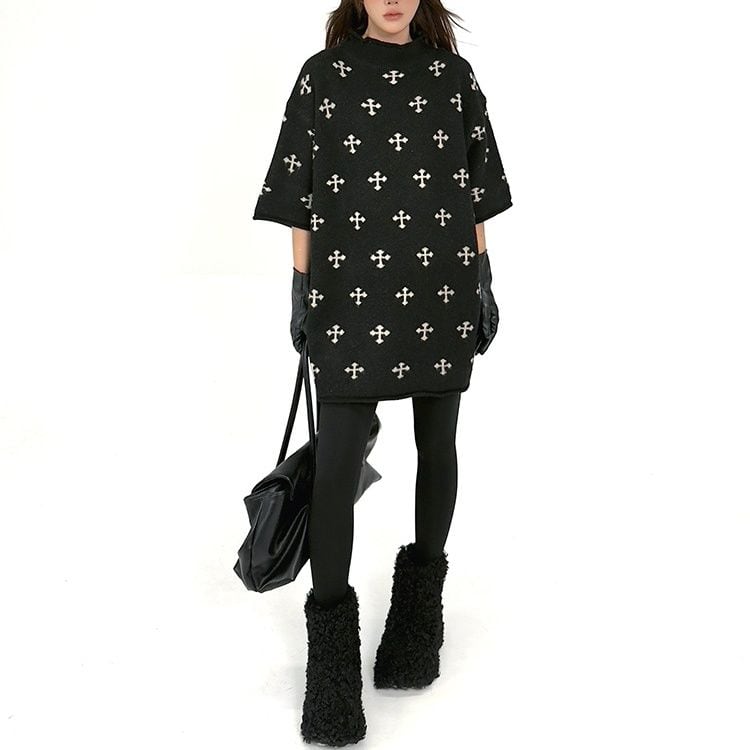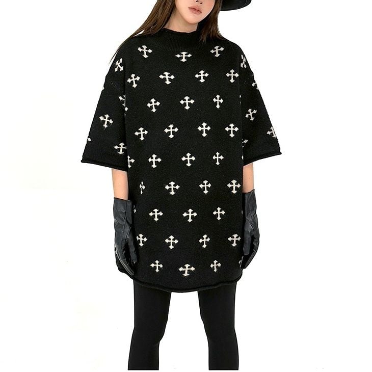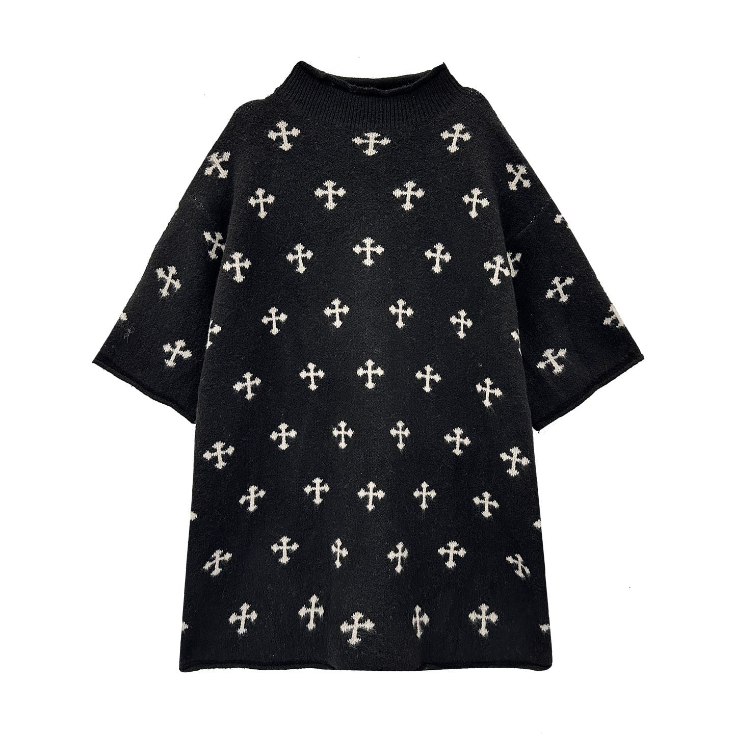 ブラック地にクロスの柄が目を惹く、モックネック・半袖・チュニック丈のプルオーバーニットです。ドロップショルダーのゆったりとしたシルエットで、コーディネートにアレンジの利くアイテムです。