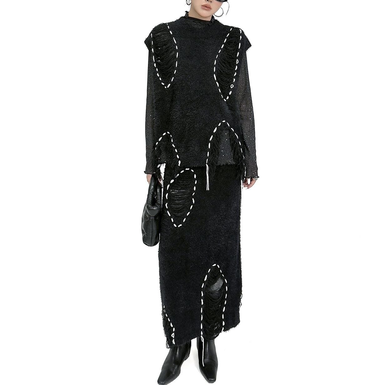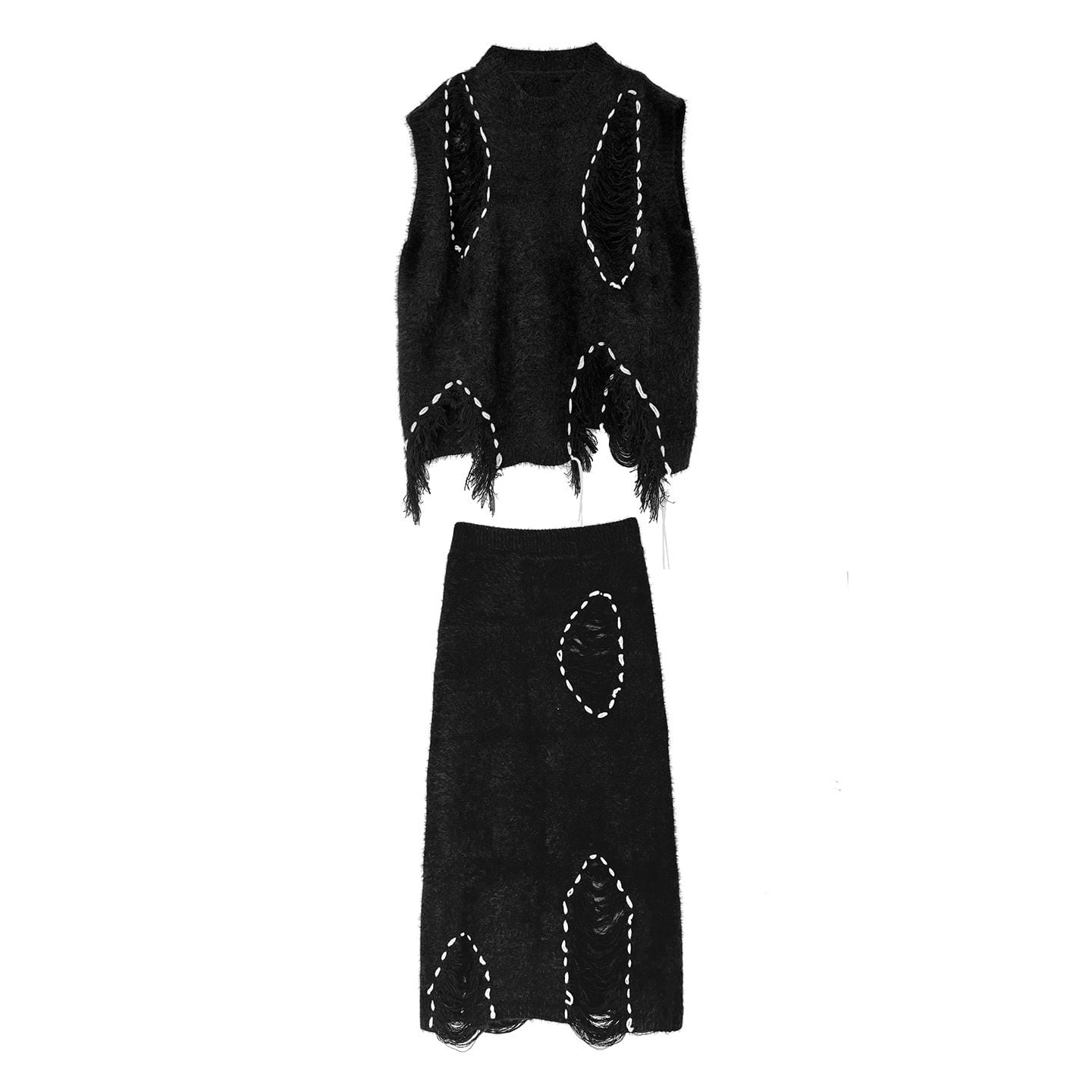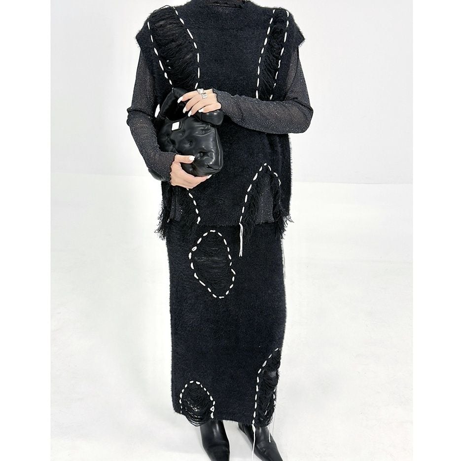 BLACK DAMAGED PULLOVER KNIT VEST & LONG SKIRT SET 2pieces 1color M-15611