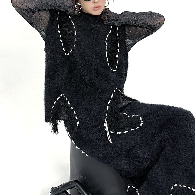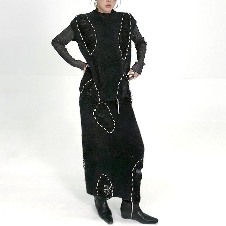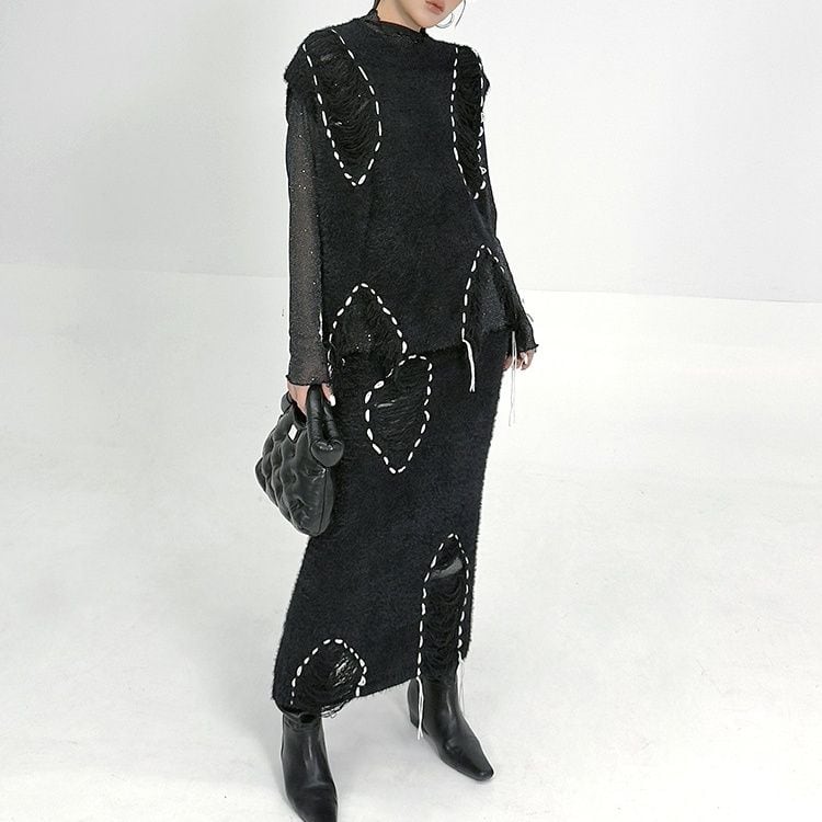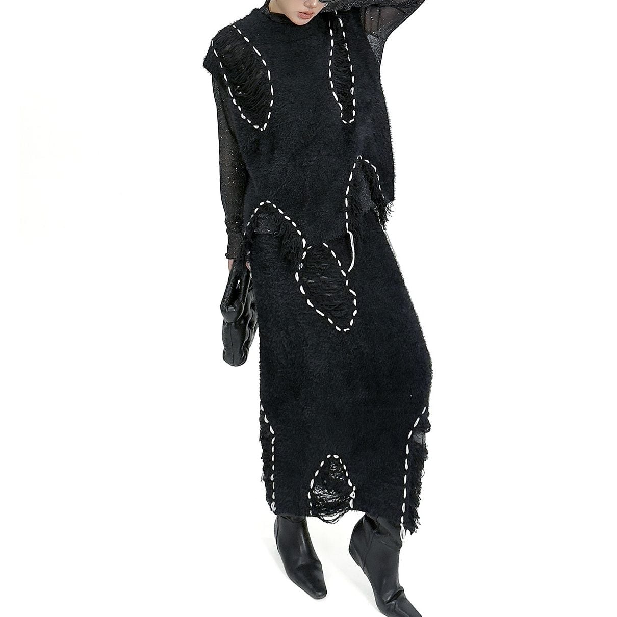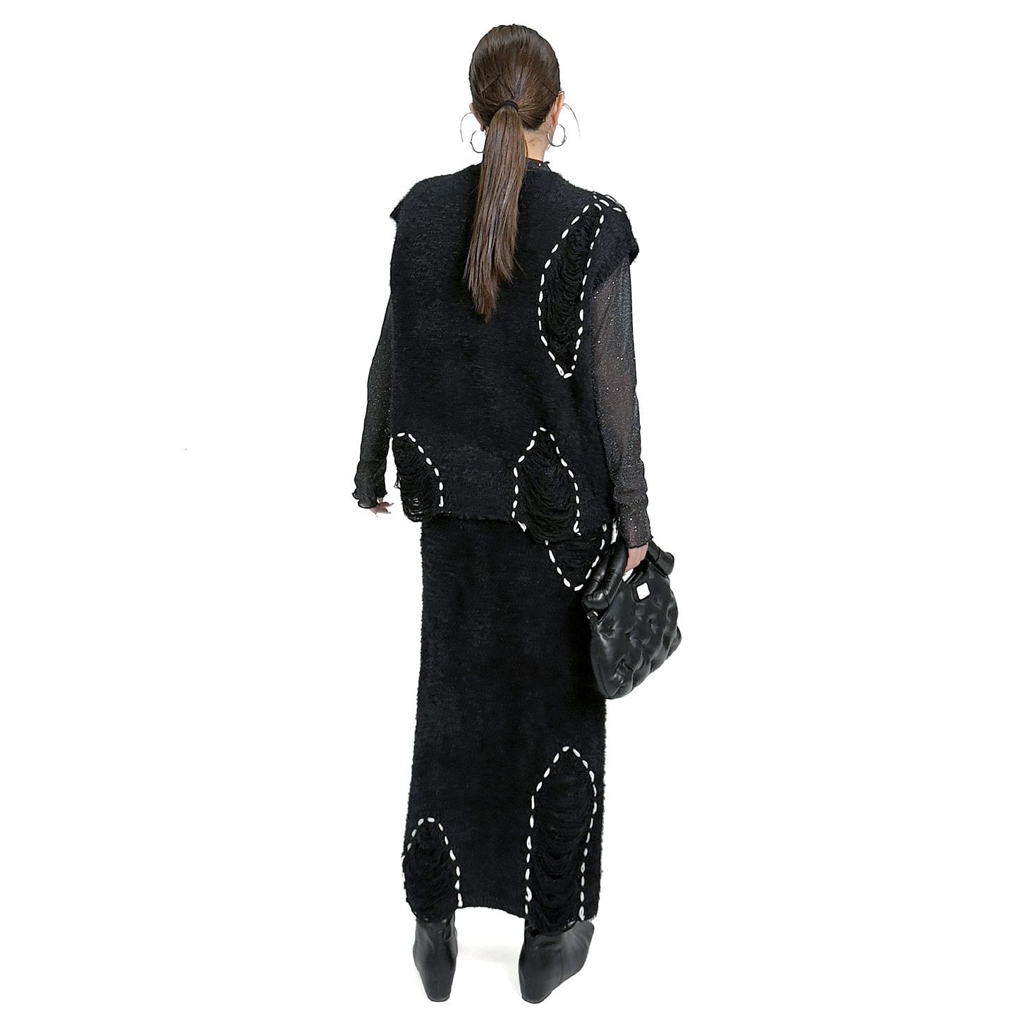 BLACK DAMAGED PULLOVER KNIT VEST & LONG SKIRT SET 2pieces 1color M-15611
