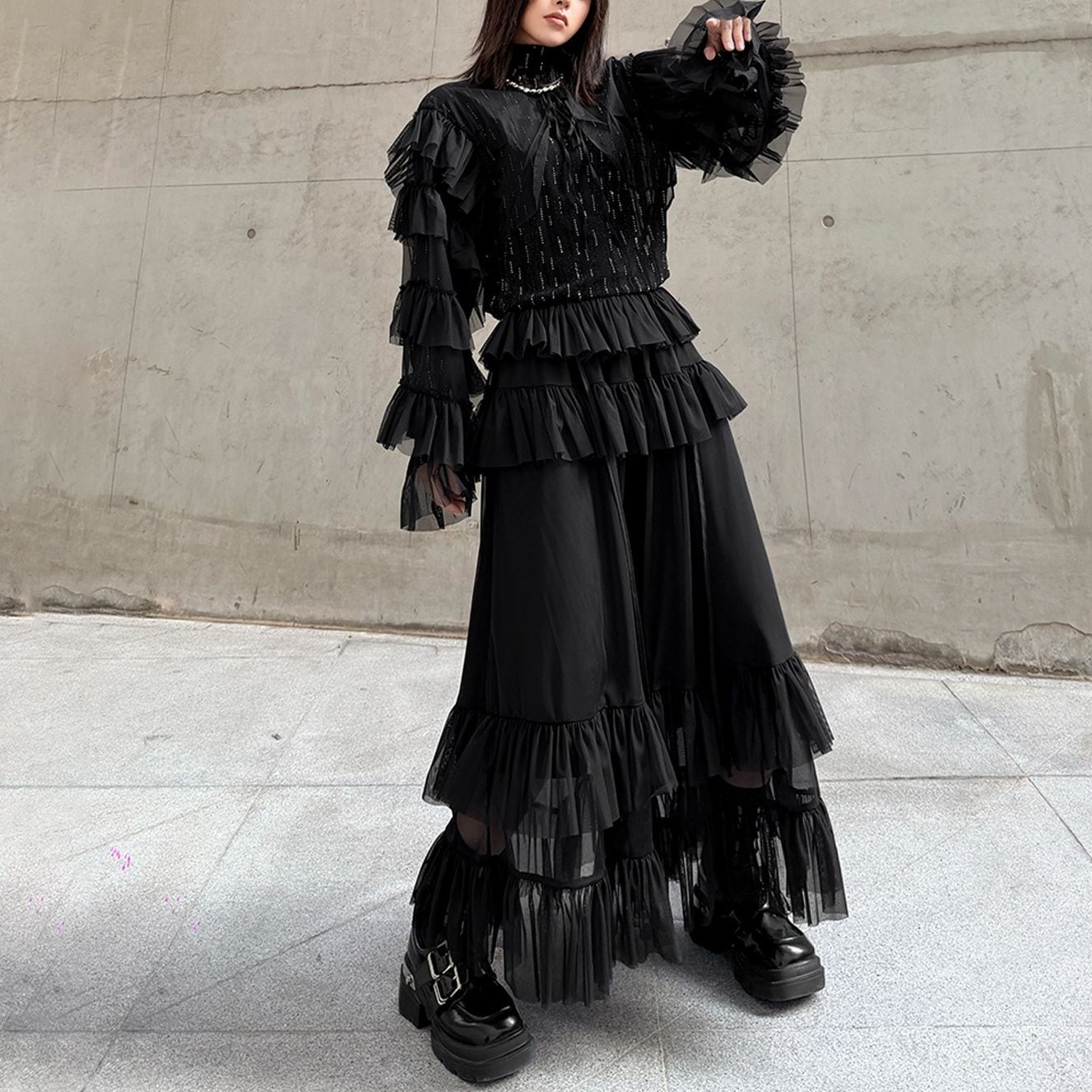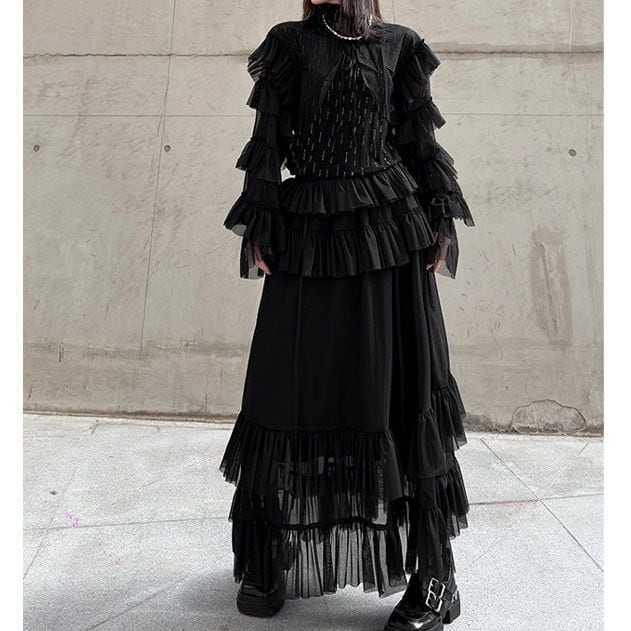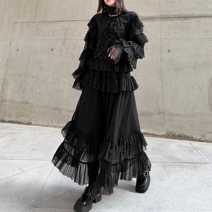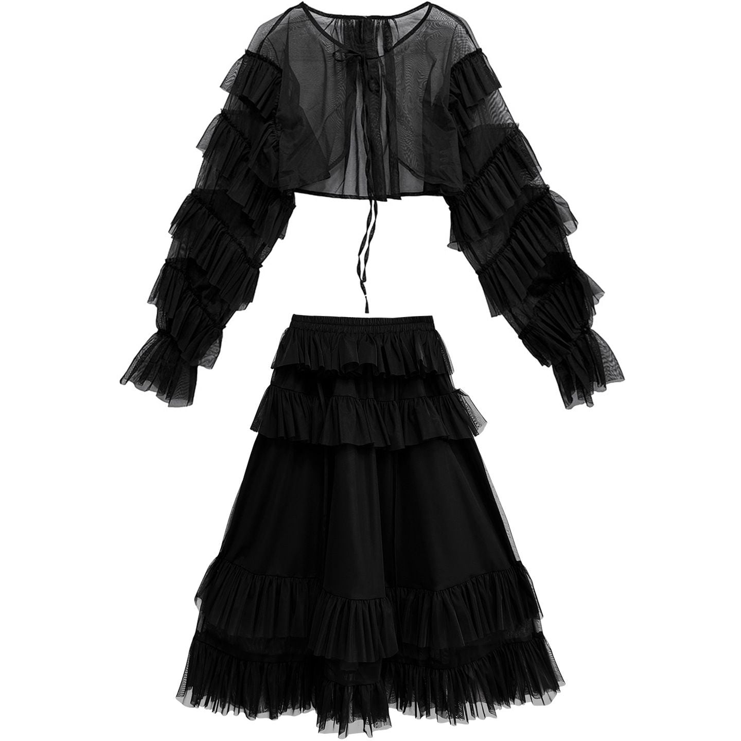 ふんだんにあしらわれたメッシュのフリルが豪華な、ボレロとロングスカートのセットアップです。上下別売りです。スカートはシルエットにアレンジの利くデザインで、上下共に透け感が魅力的な、ブラックで使いやすいアイテムです。