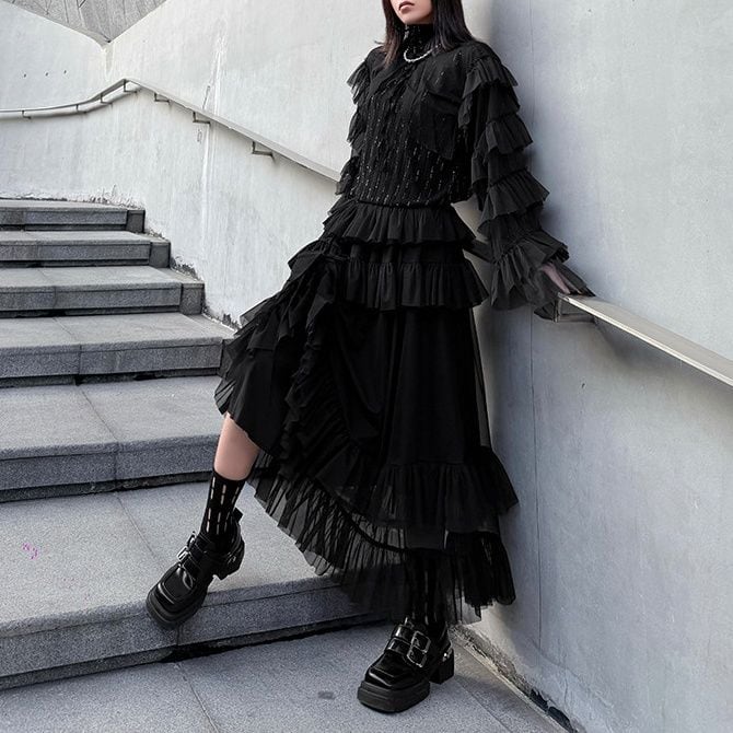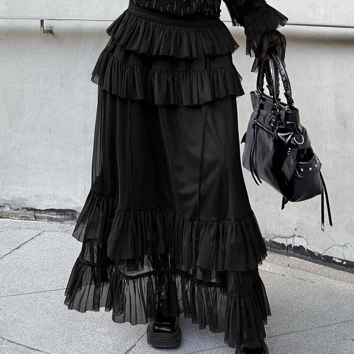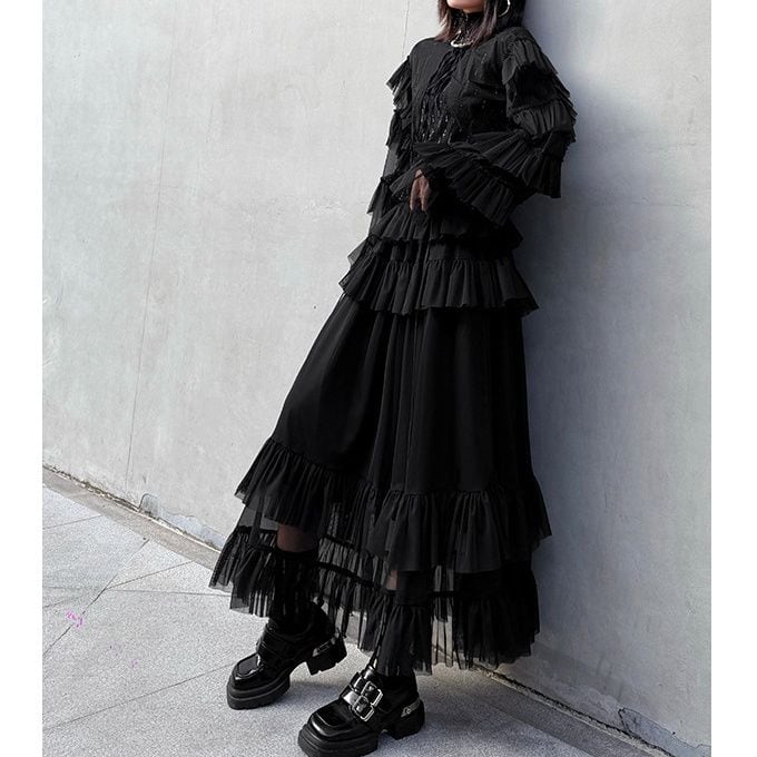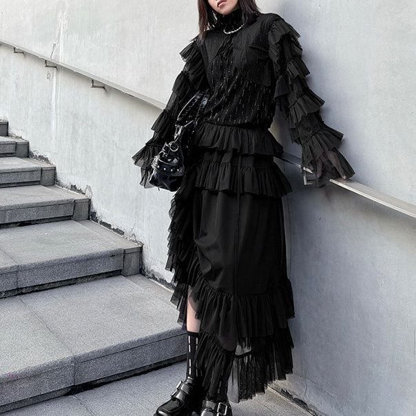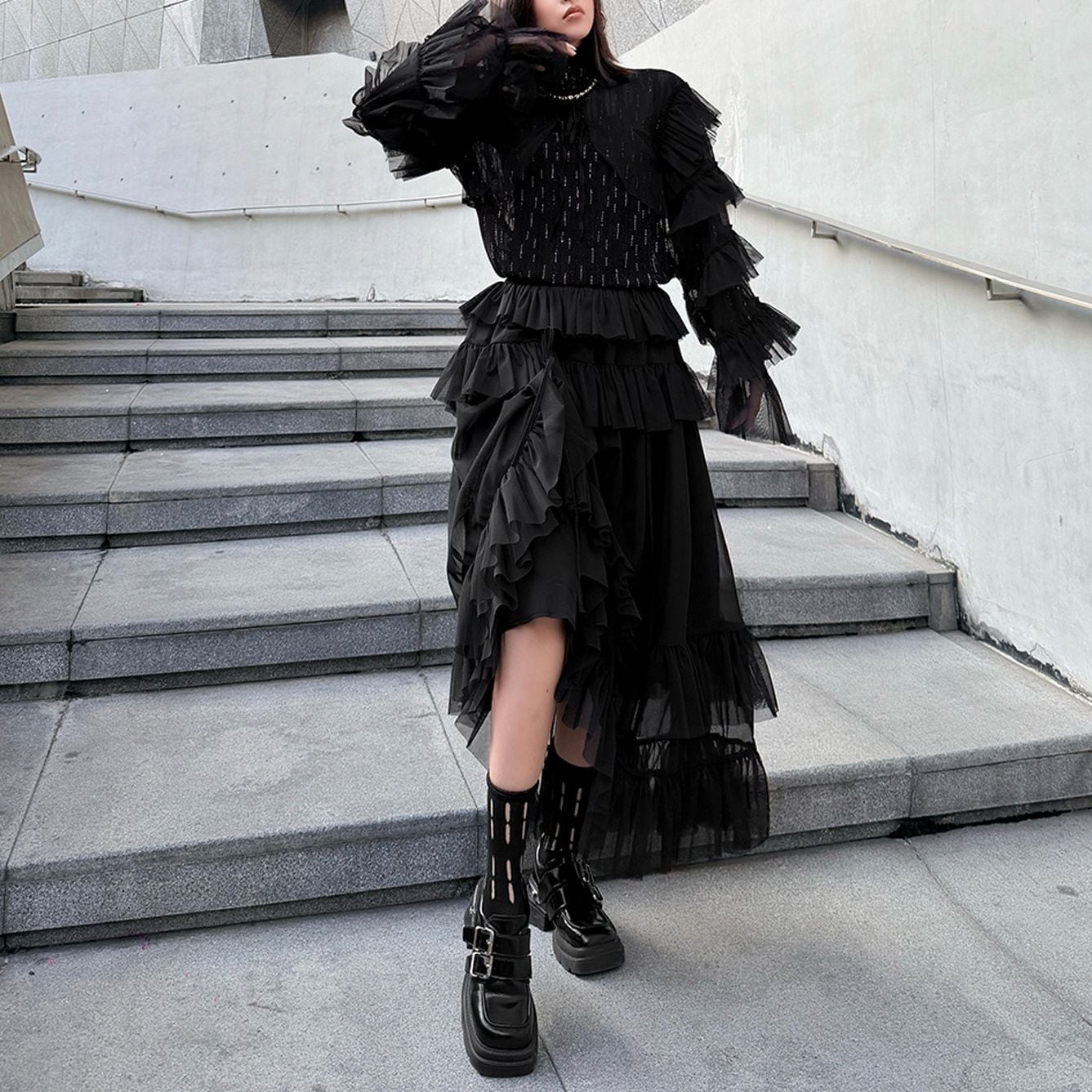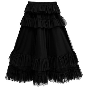 ふんだんにあしらわれたメッシュのフリルが豪華な、ボレロとロングスカートのセットアップです。上下別売りです。スカートはシルエットにアレンジの利くデザインで、上下共に透け感が魅力的な、ブラックで使いやすいアイテムです。