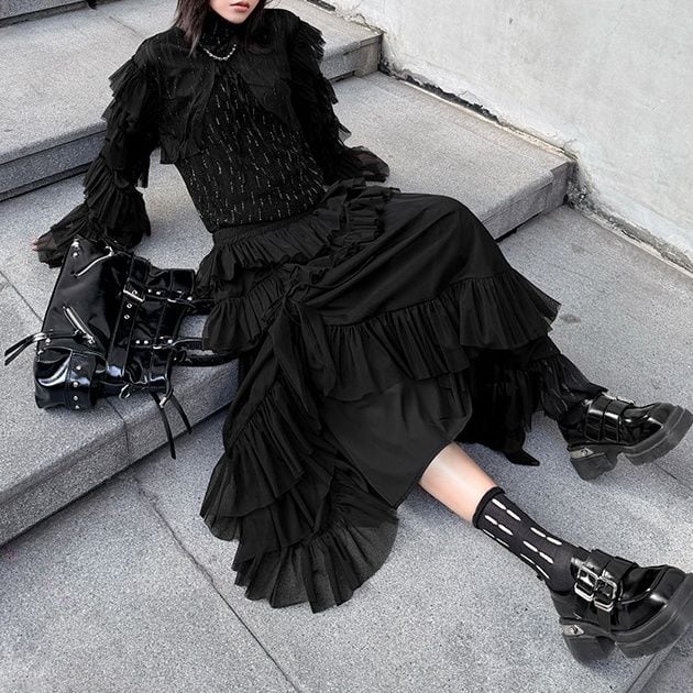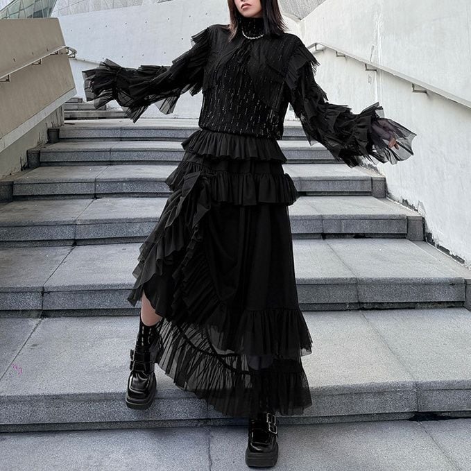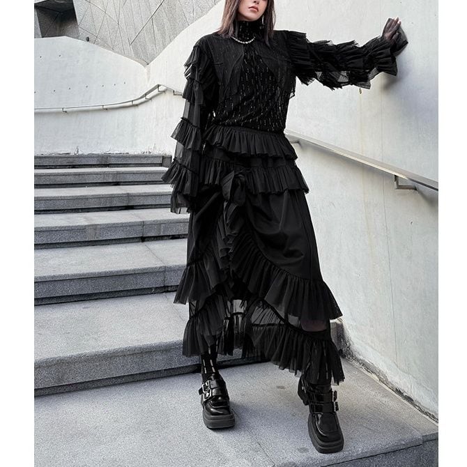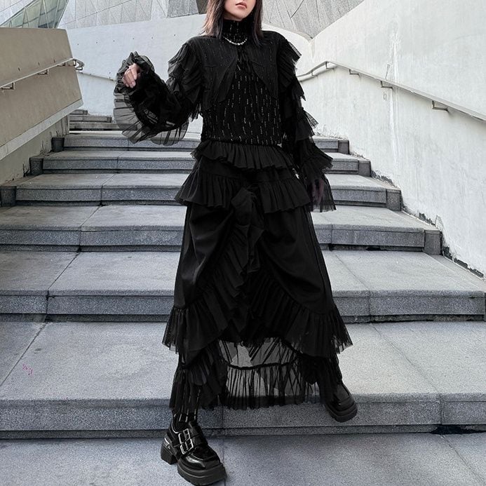 BLACK FRILL TRIMMED MESH BOLERO & A-LINE LONG SKIRT 1color M-15613