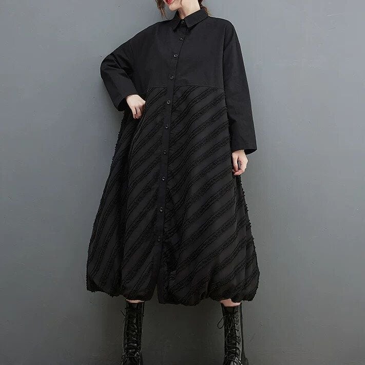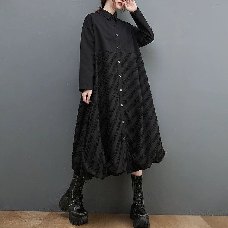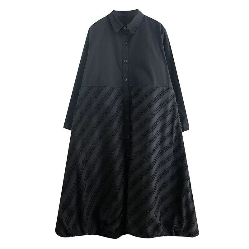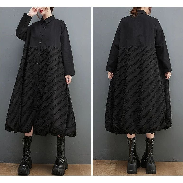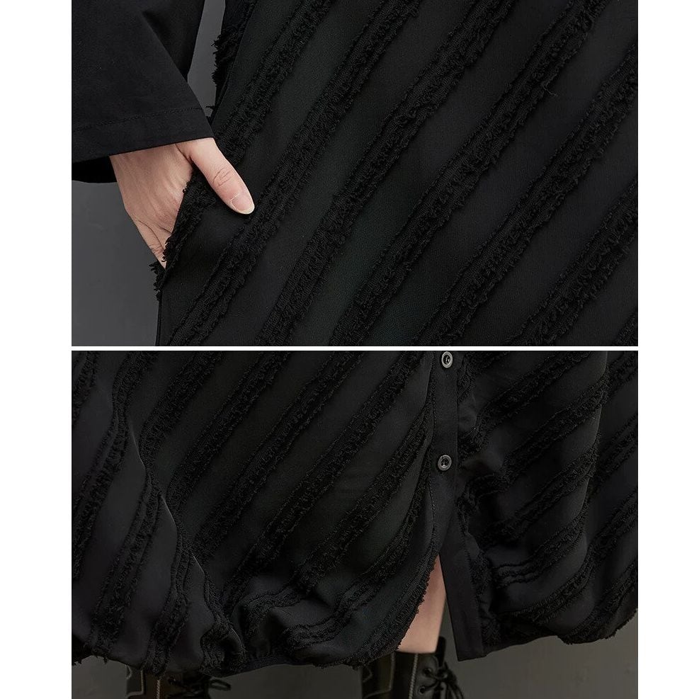 斜めの3Dストライプのスティッチがお洒落な、ポロ襟・長袖・ミドル丈のシャツワンピースです。裾がランタンのようになったゆったりとしたAラインシルエットが魅力的な、オールブラックで小物アレンジの利くアイテムです。