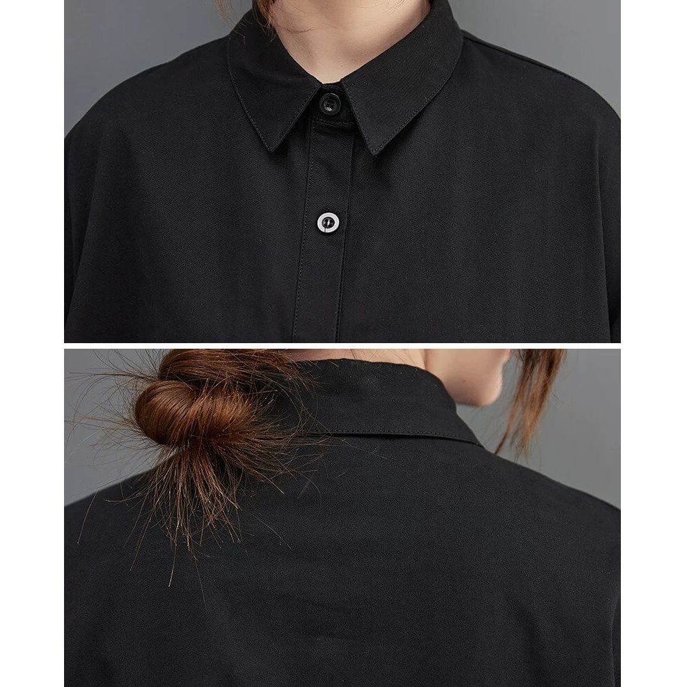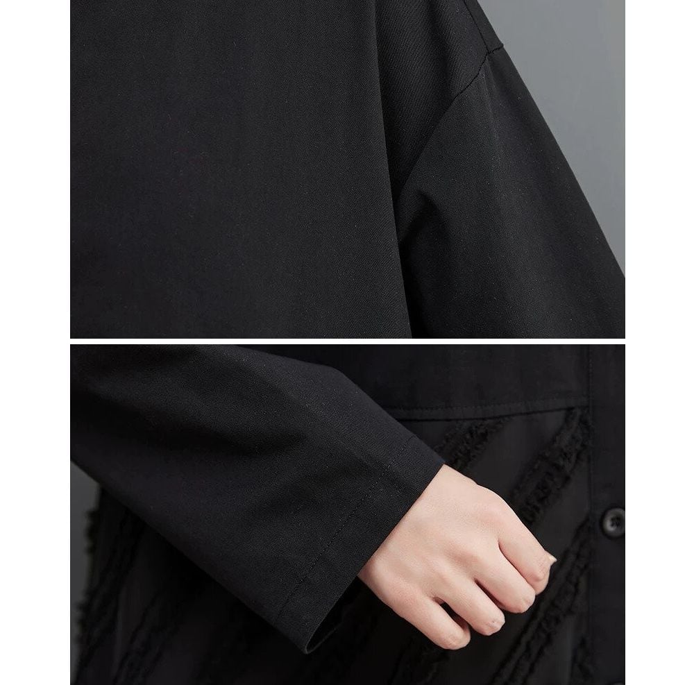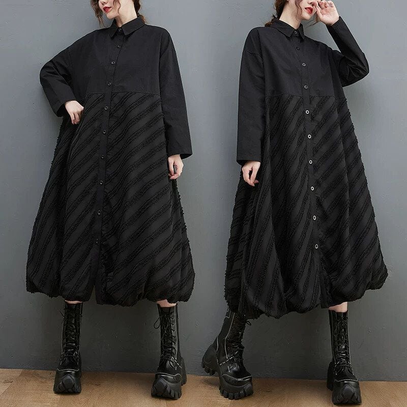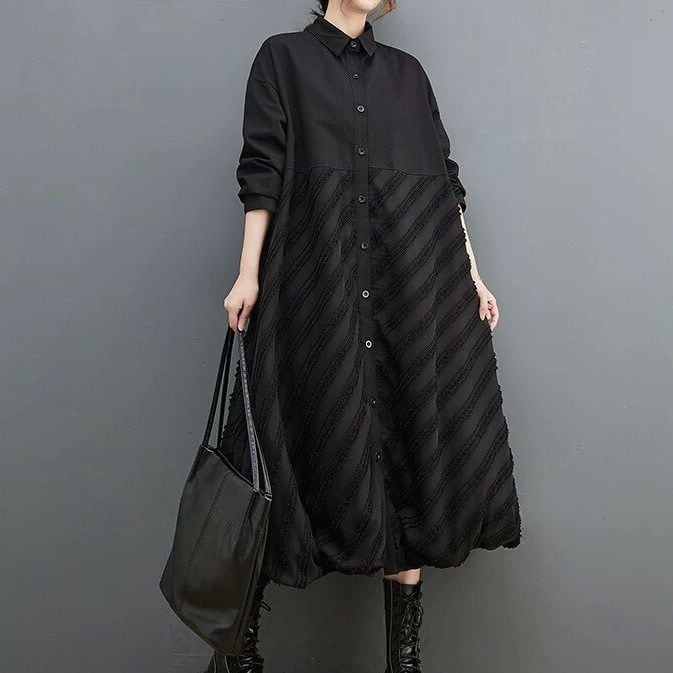 斜めの3Dストライプのスティッチがお洒落な、ポロ襟・長袖・ミドル丈のシャツワンピースです。裾がランタンのようになったゆったりとしたAラインシルエットが魅力的な、オールブラックで小物アレンジの利くアイテムです。