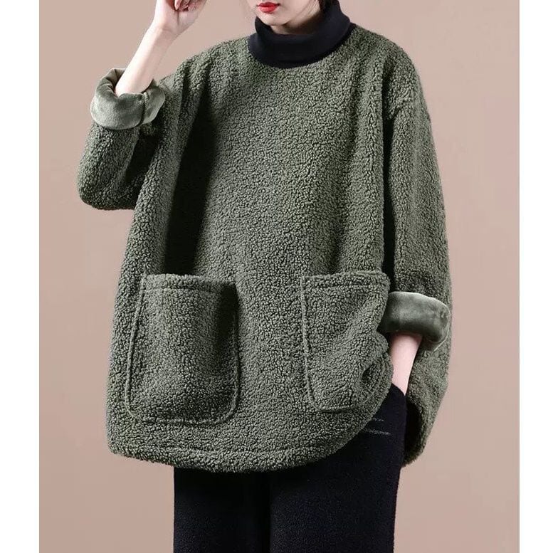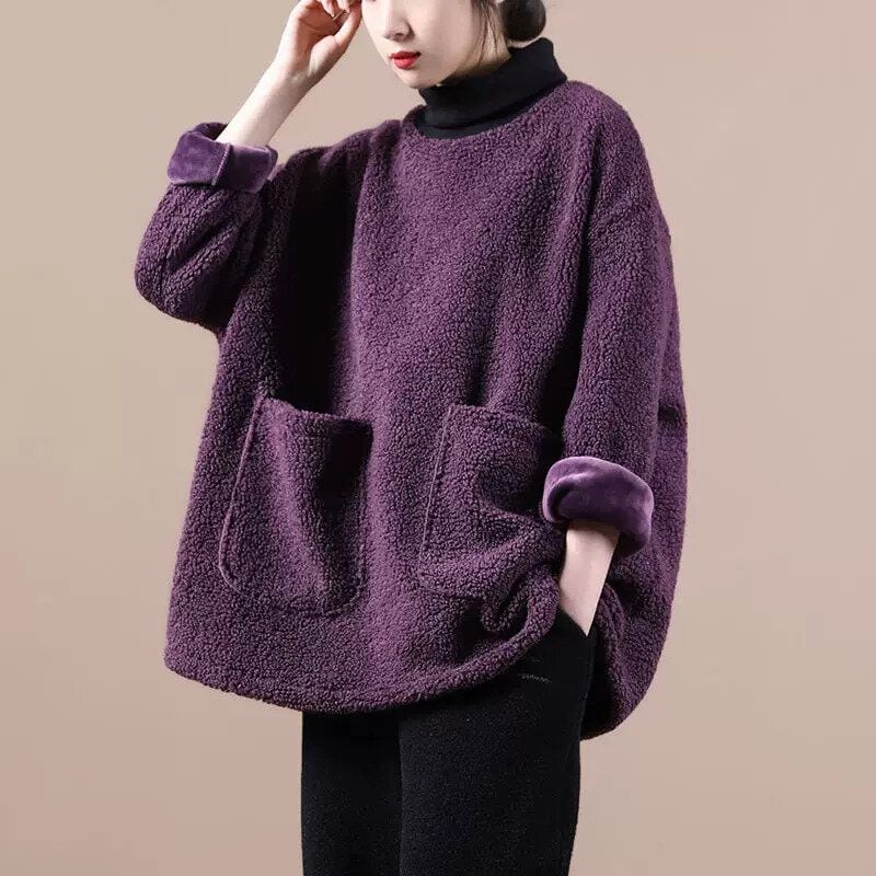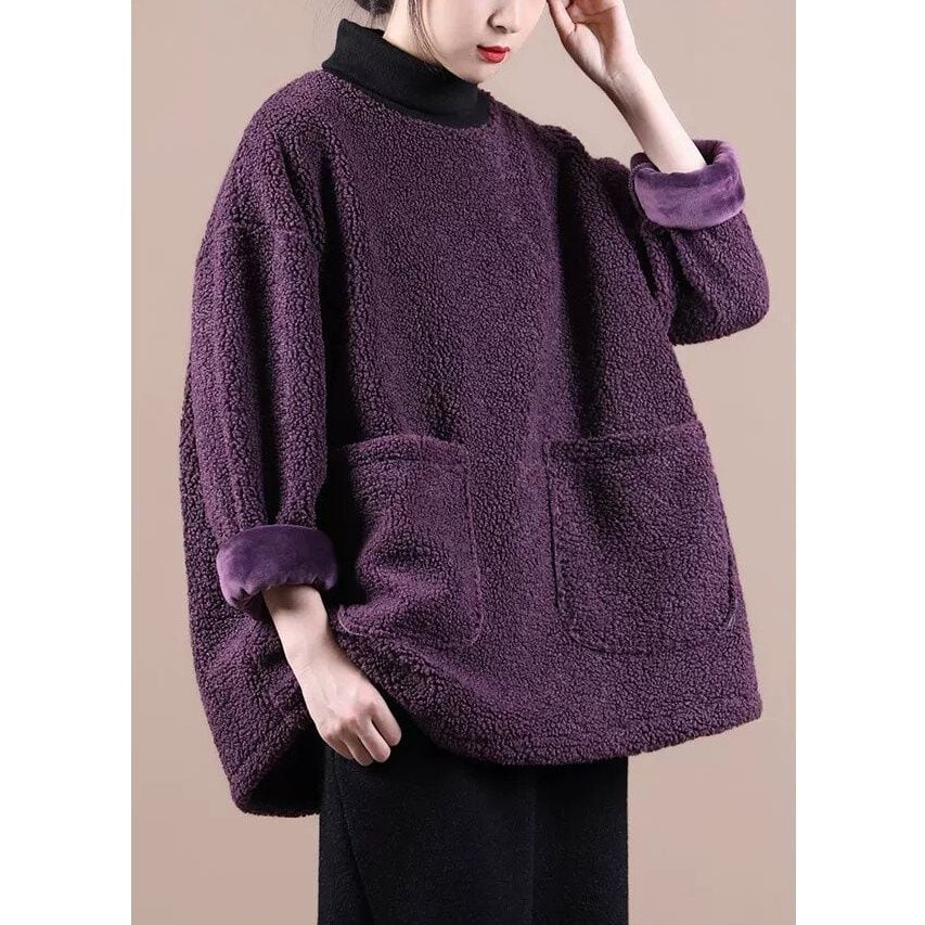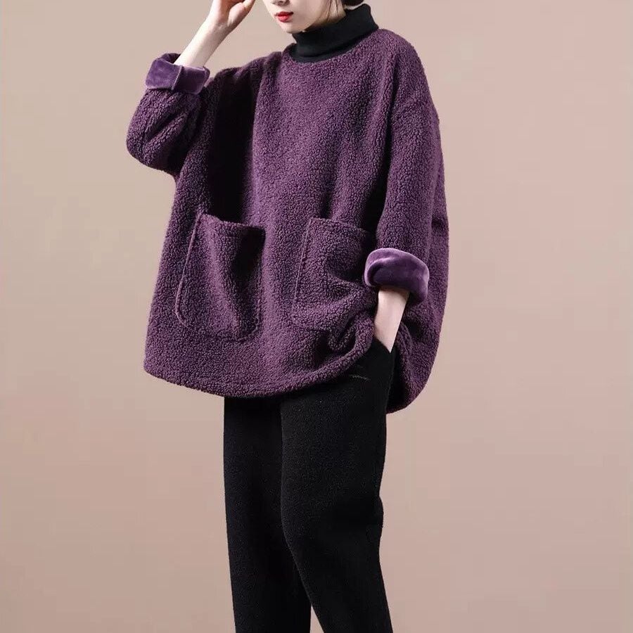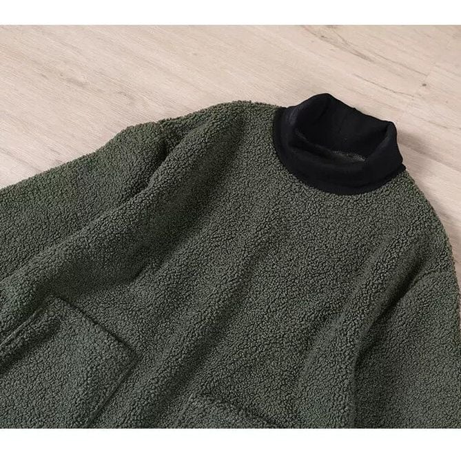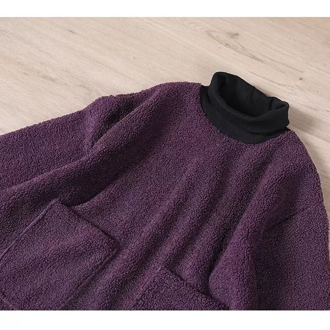 ブラックのハイネックがアクセントになった、フェイクツーピースデザインのプルオーバートップです。ボアフリースに滑らかな起毛のライニングで温かい、ゆったりとしたシルエットと大きなポケットがキュートなカジュアルアイテムです。色はグリーンとパープルの2色から選べます。