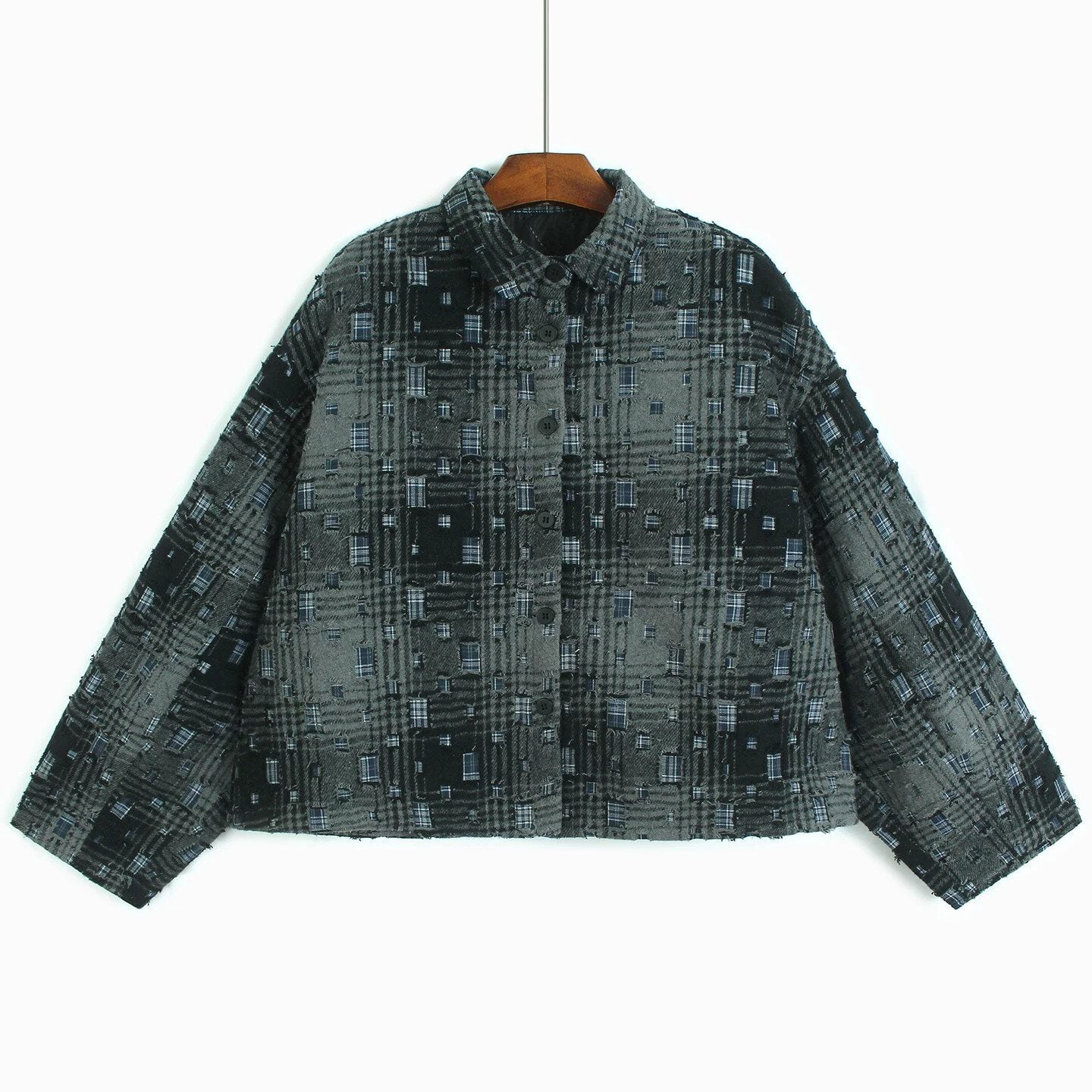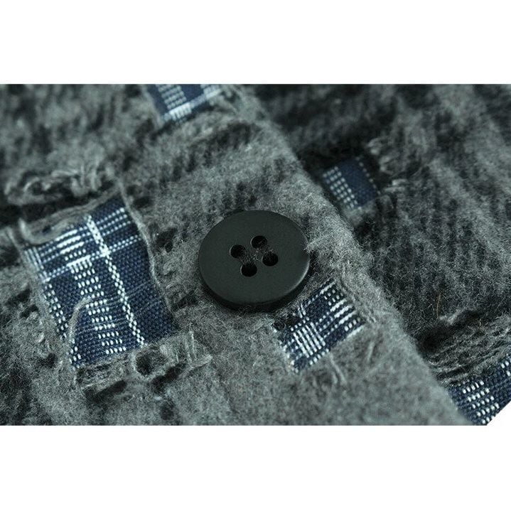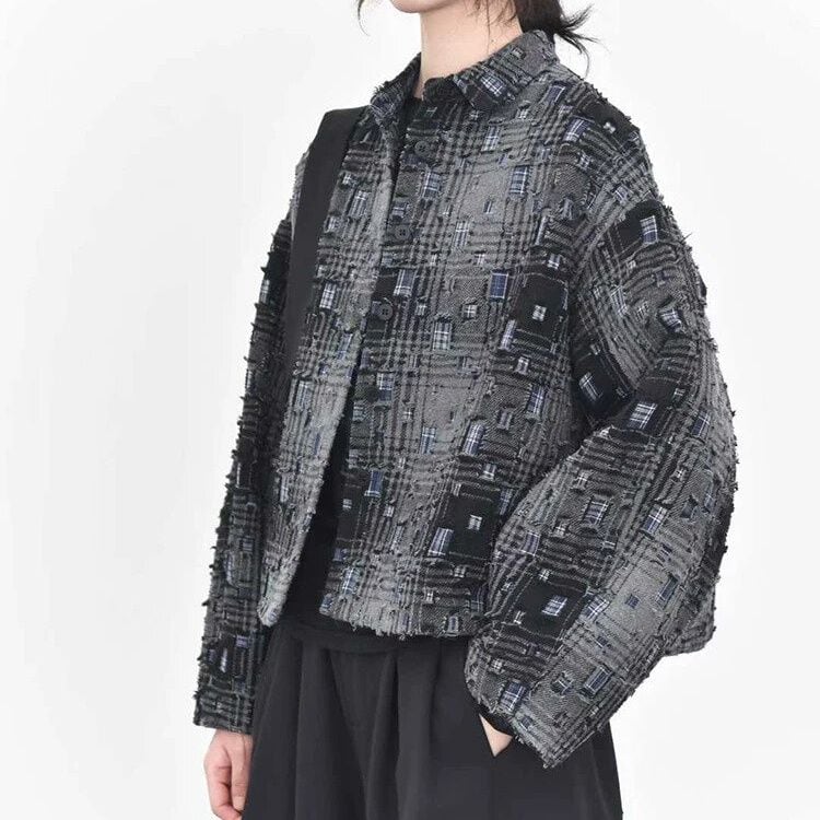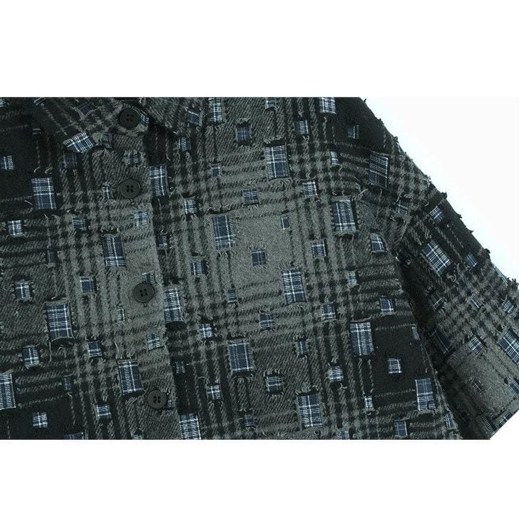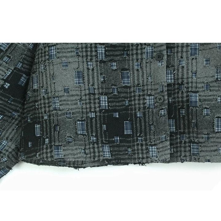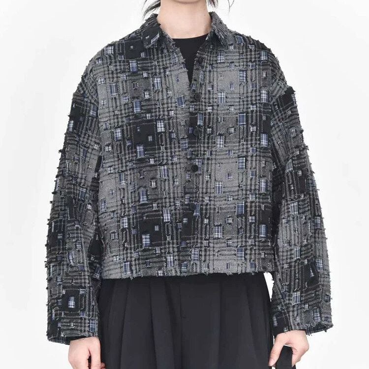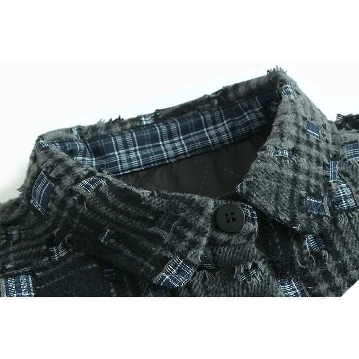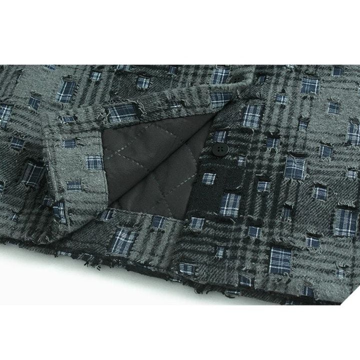 ダメージ加工やパッチが散りばめられたレトロなチェック柄がお洒落な、ポロ襟・長袖ショート丈のシャツジャケットです。キルティングの裏地で温かい、落ち着いた色味で合わせやすいクールな印象のアイテムです。