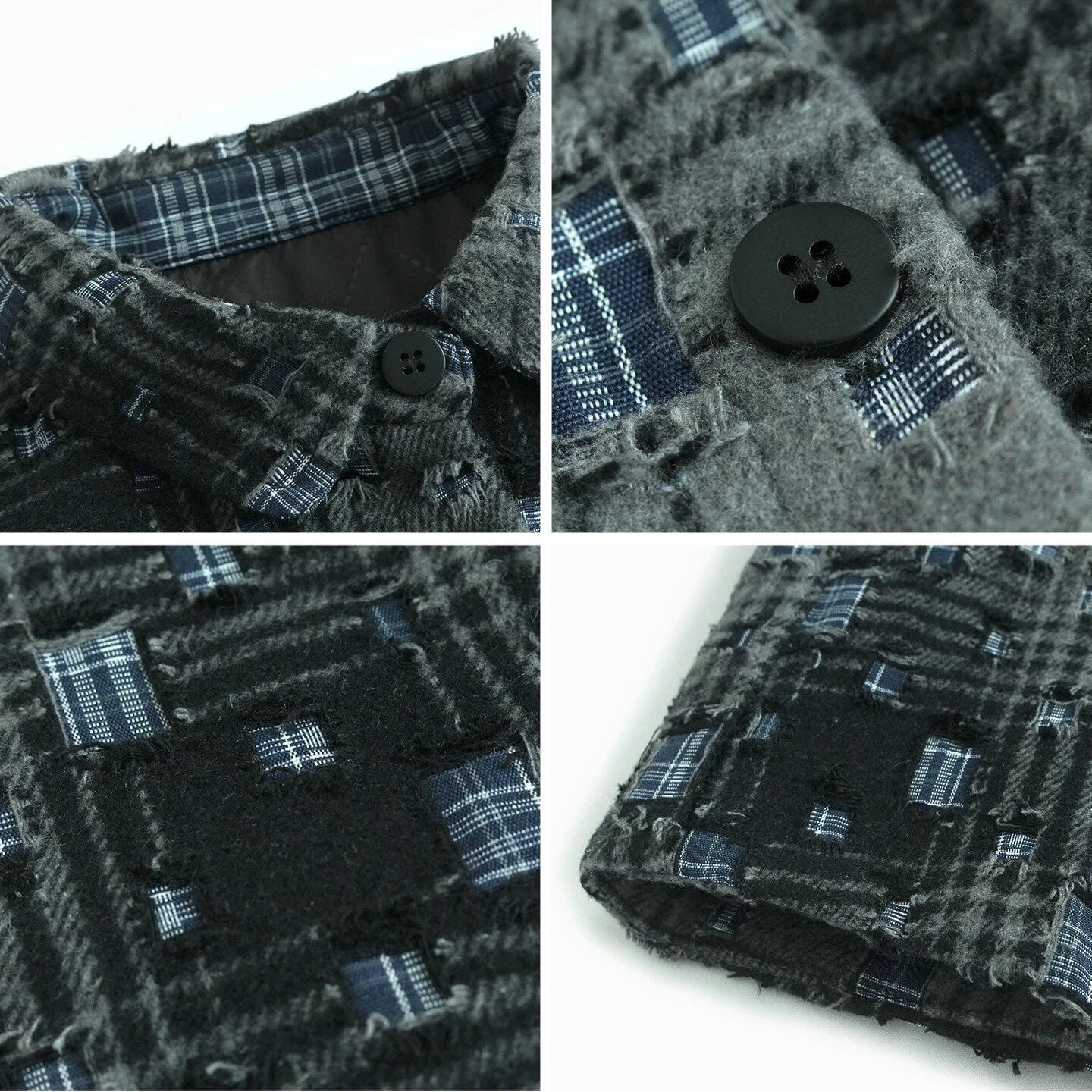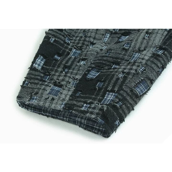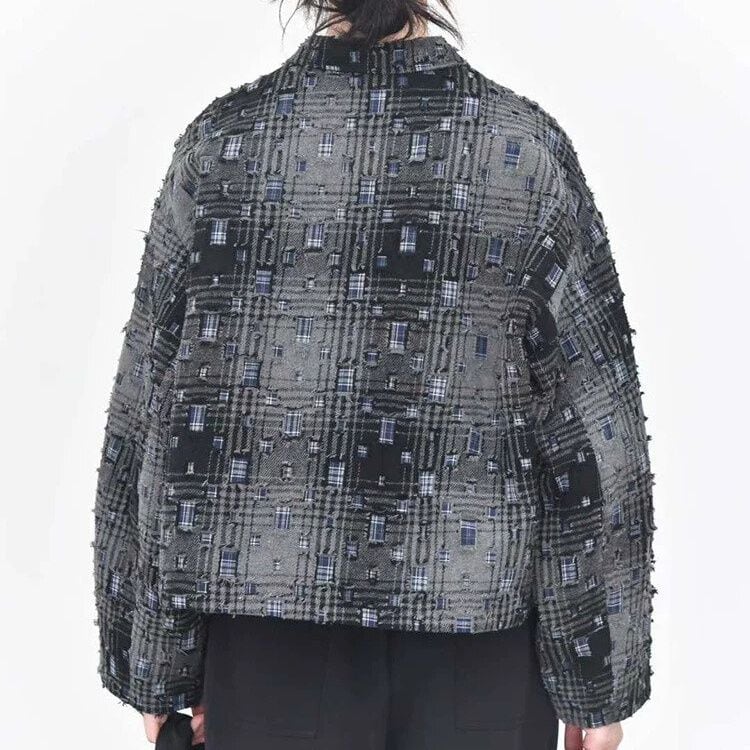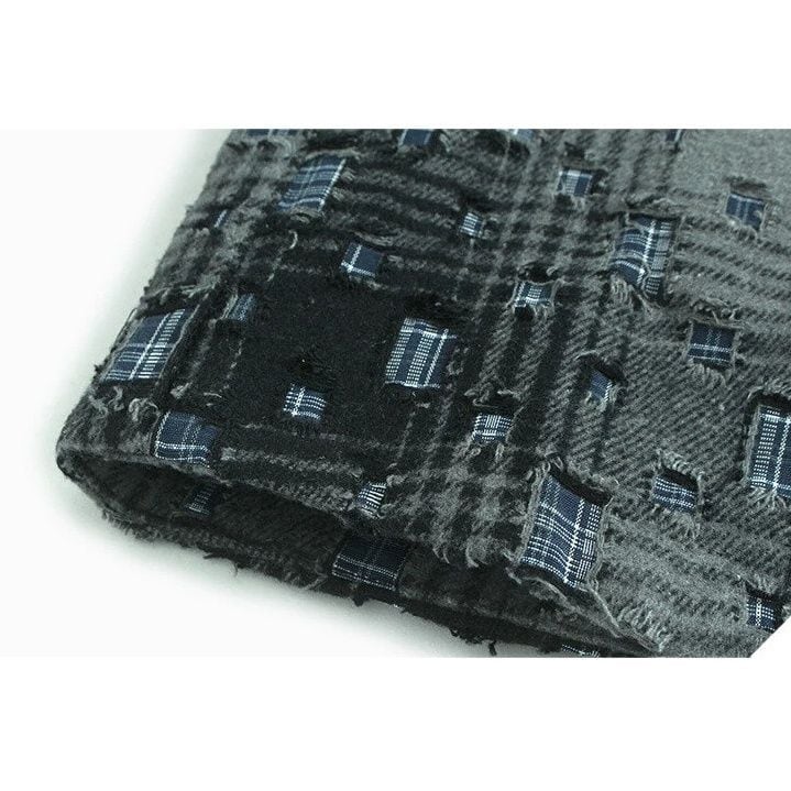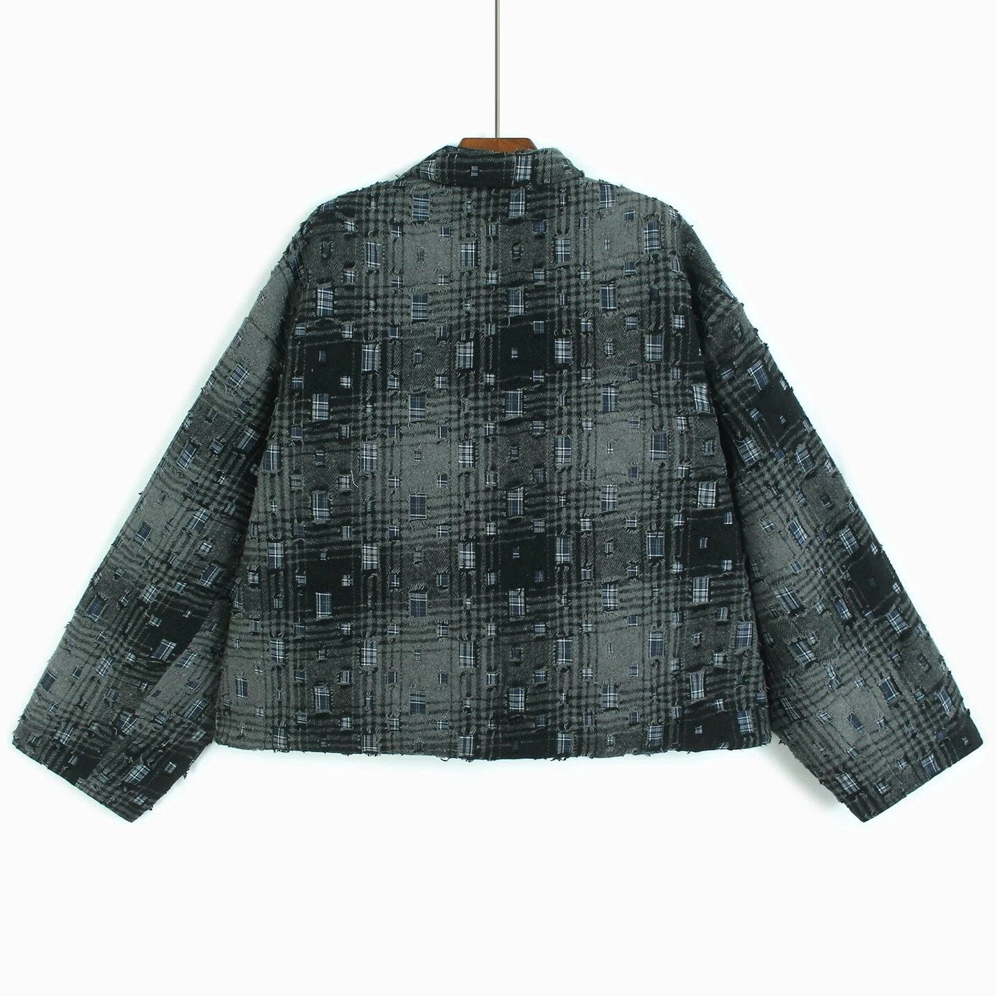 ダメージ加工やパッチが散りばめられたレトロなチェック柄がお洒落な、ポロ襟・長袖ショート丈のシャツジャケットです。キルティングの裏地で温かい、落ち着いた色味で合わせやすいクールな印象のアイテムです。