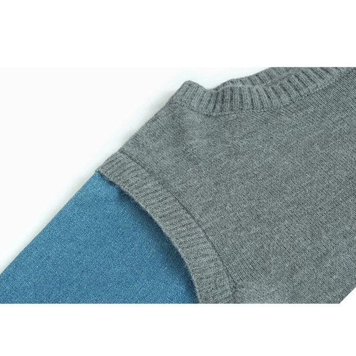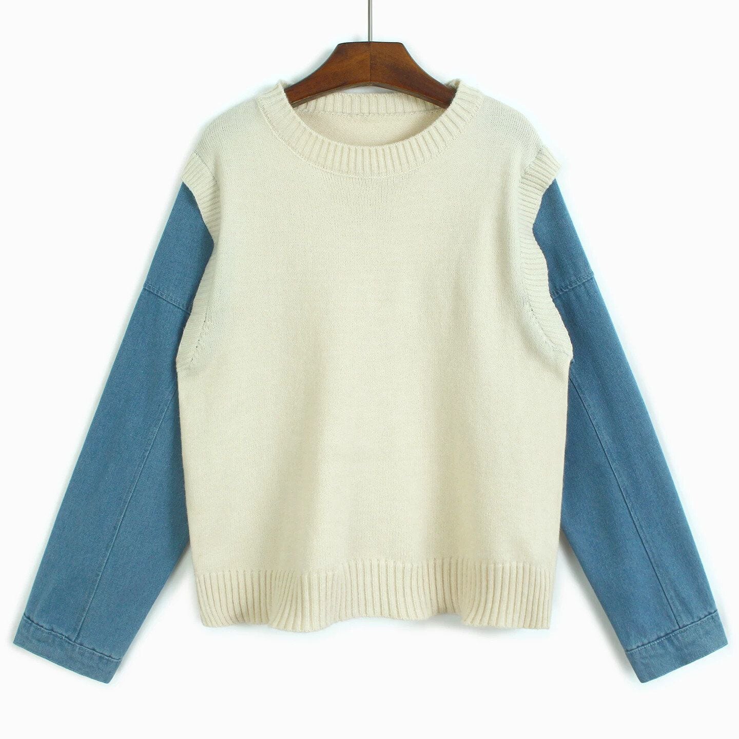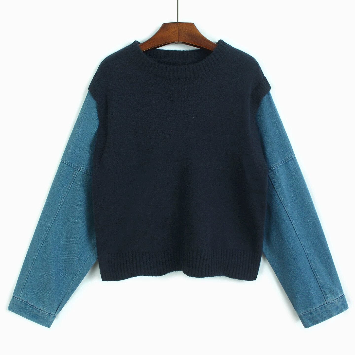 FAKE-2-PIECE DENIM SLEEVES ROUND NECK KNIT TOP 3colors M-15643