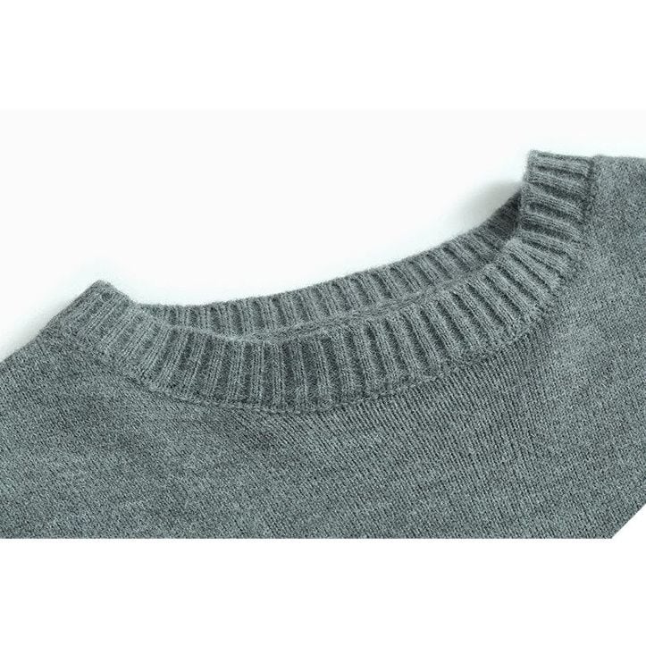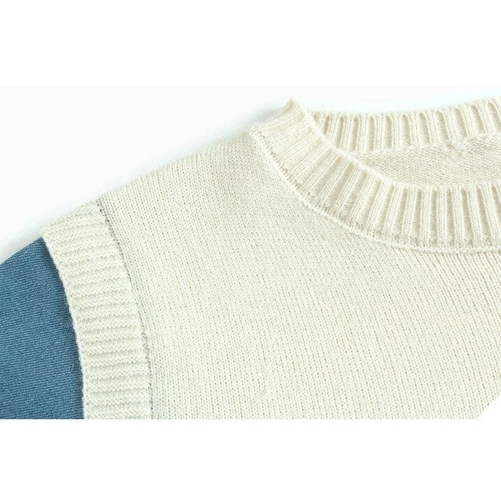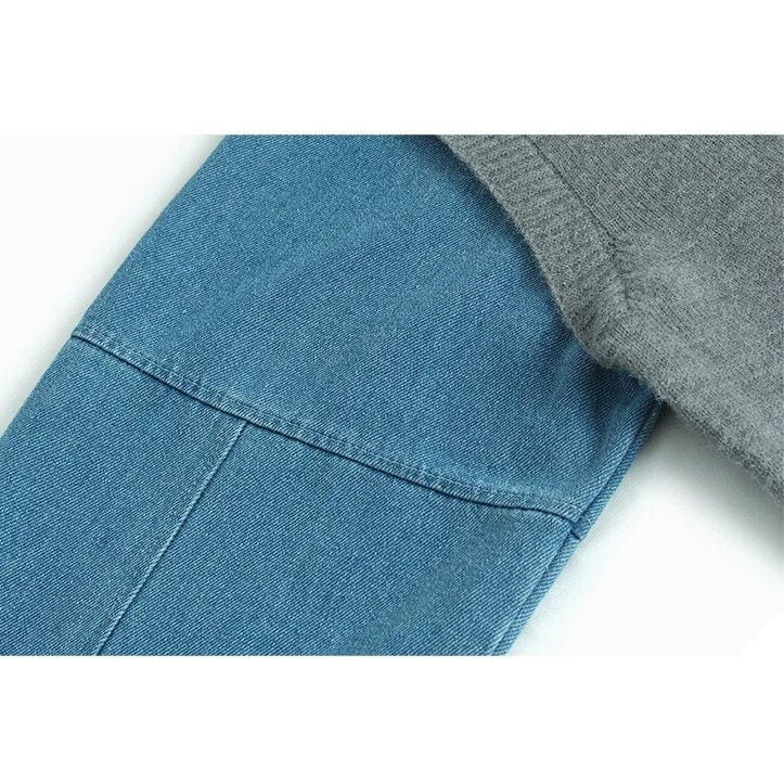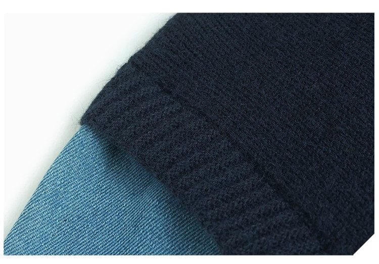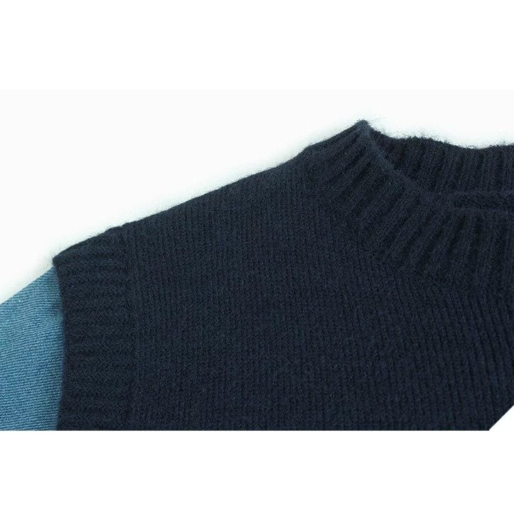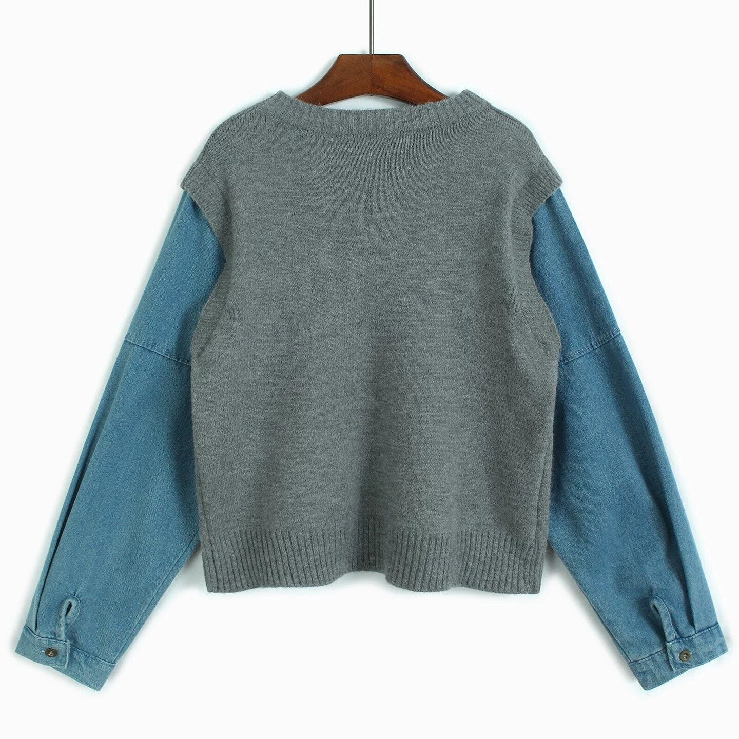 FAKE-2-PIECE DENIM SLEEVES ROUND NECK KNIT TOP 3colors M-15643