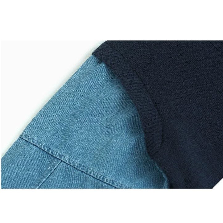 ニットベストにデニムシャツの袖が付いたフェイクツーピースデザインがキュートな、ラウンドネック・長袖・プルオーバートップです。シンプルなデザインと合わせやすいカラーが嬉しい、コーディネートのアクセントになるアイテムです。色は3色から選べます。