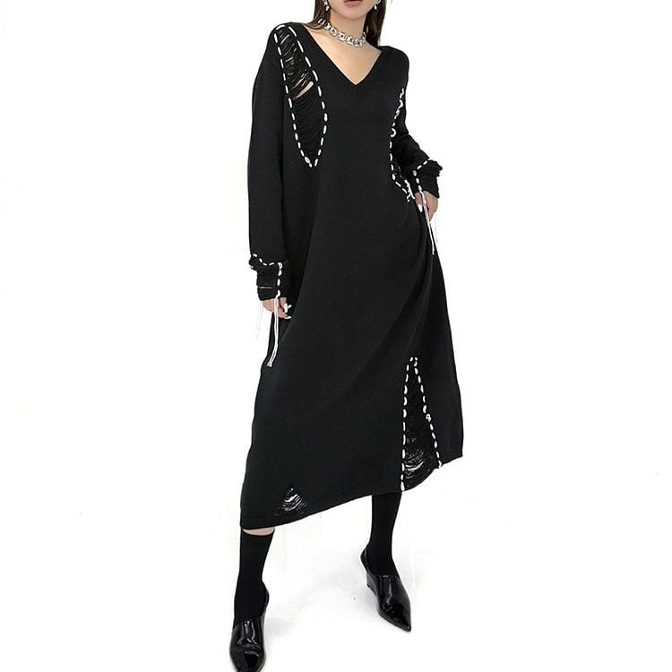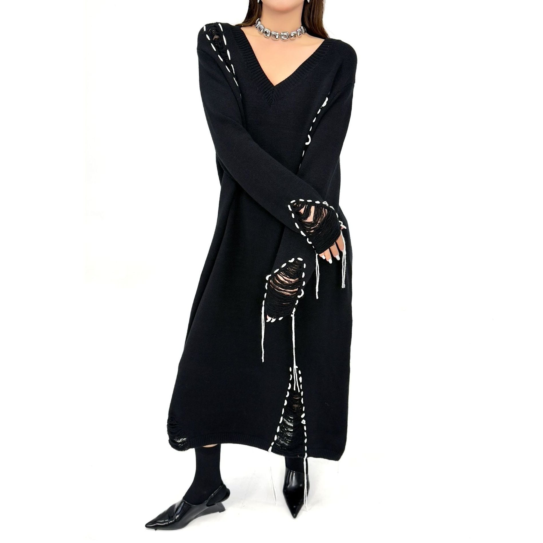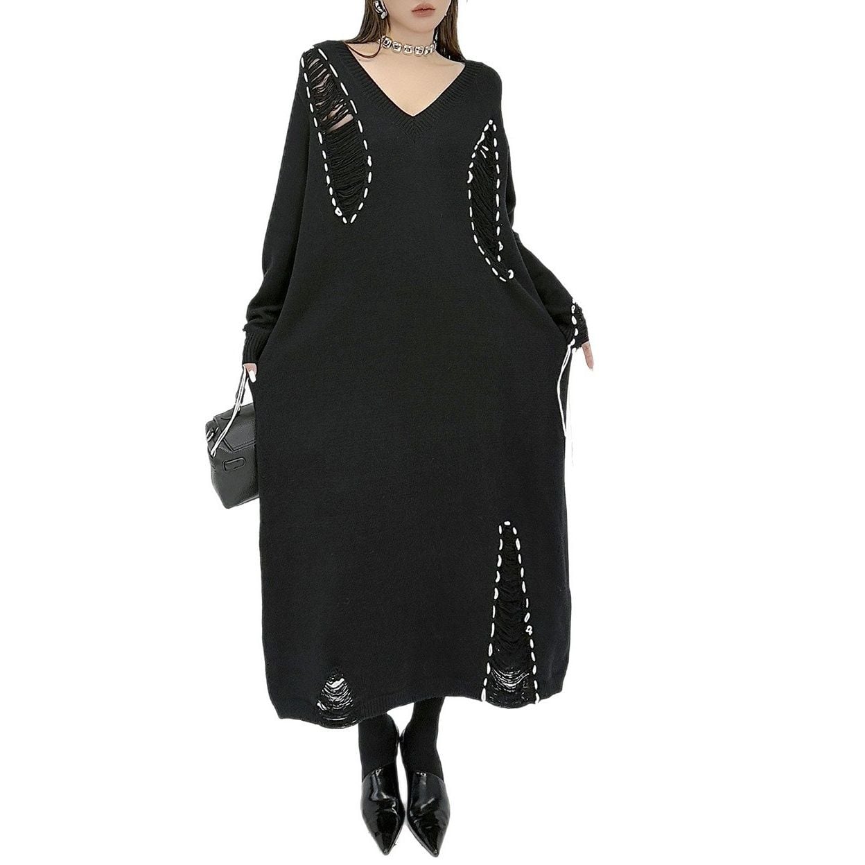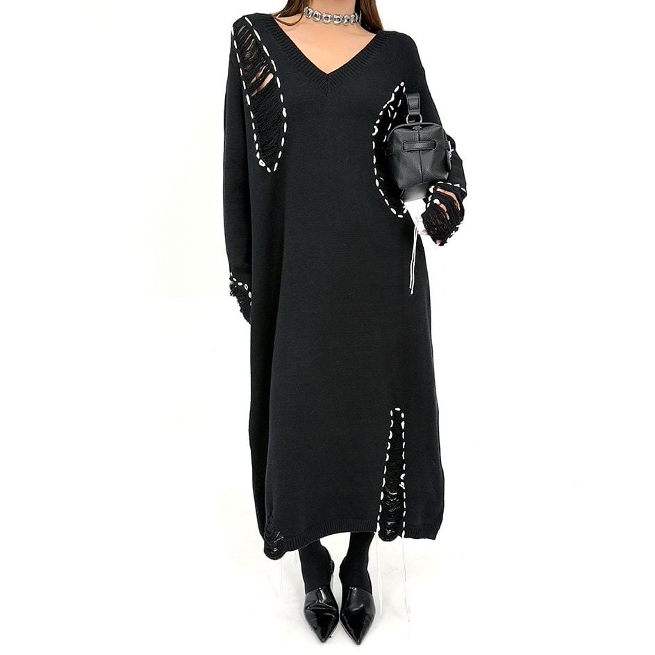 白い毛糸のスティッチで縁取られたダメージ加工がお洒落な、Vネック・長袖・ロング丈のニットワンピースです。ブラックとホワイトのコントラストがキュートな、ゆったりとしたシルエットのカジュアルなアイテムです。