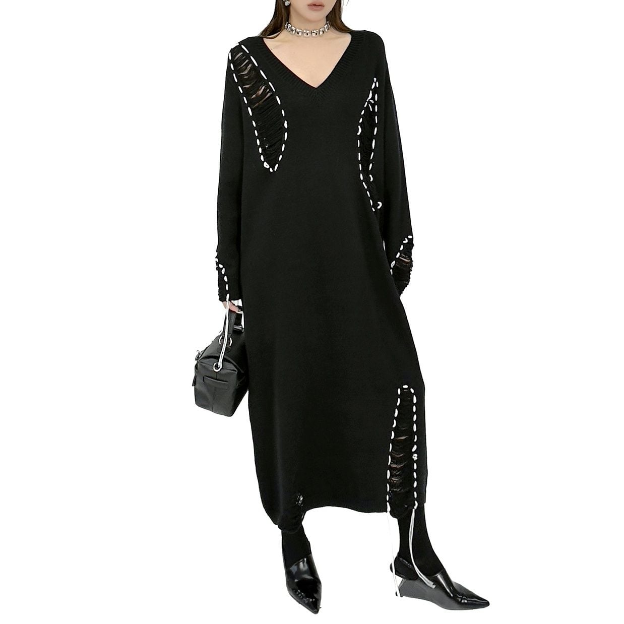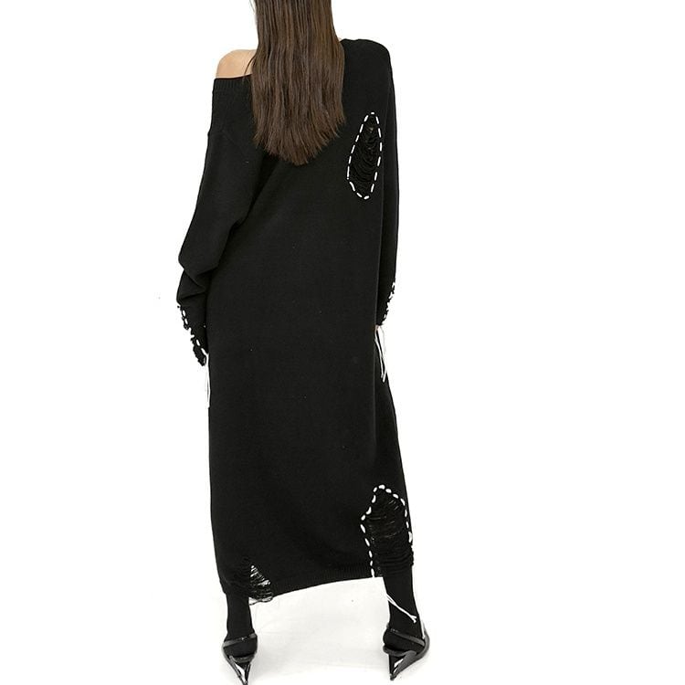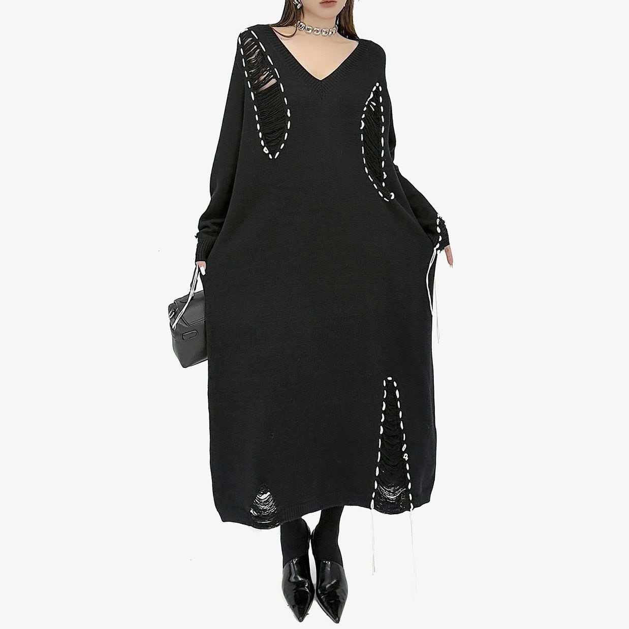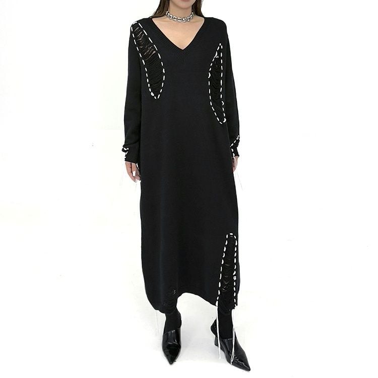 白い毛糸のスティッチで縁取られたダメージ加工がお洒落な、Vネック・長袖・ロング丈のニットワンピースです。ブラックとホワイトのコントラストがキュートな、ゆったりとしたシルエットのカジュアルなアイテムです。