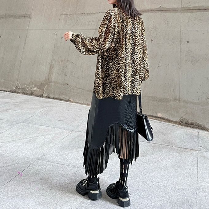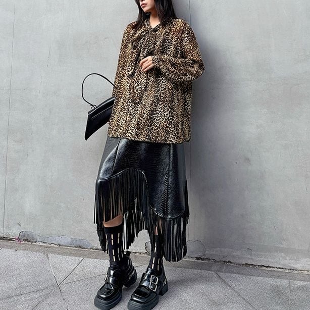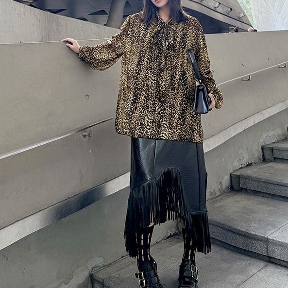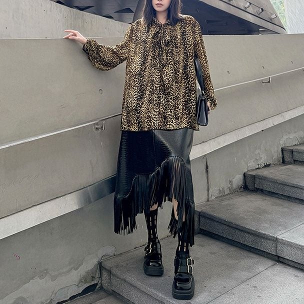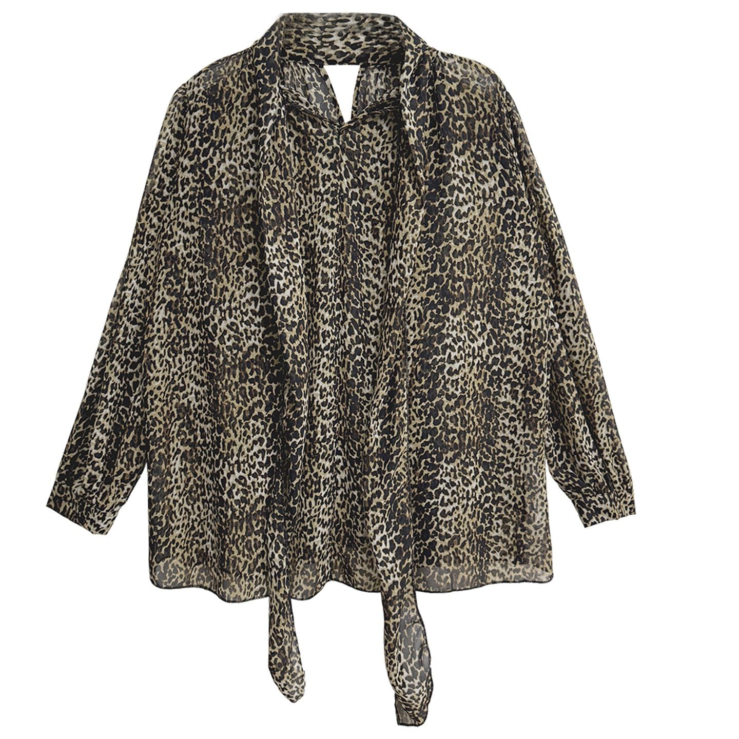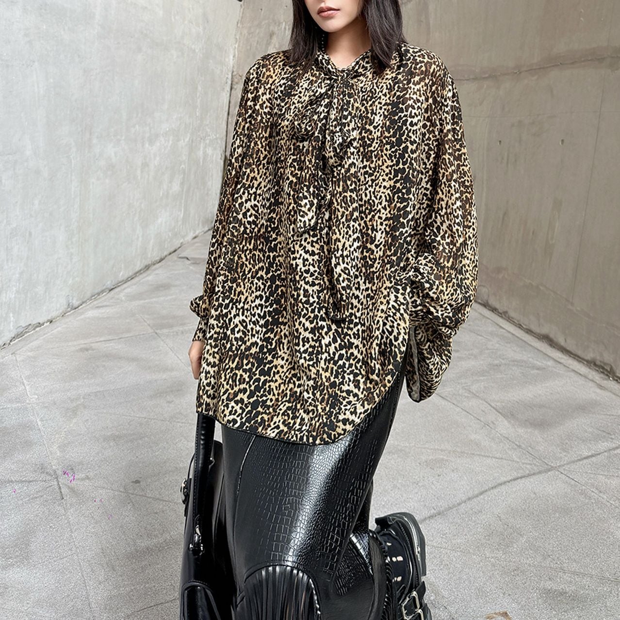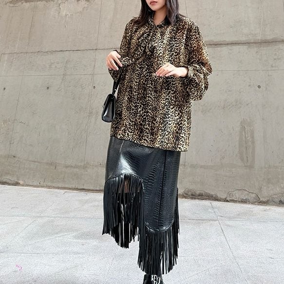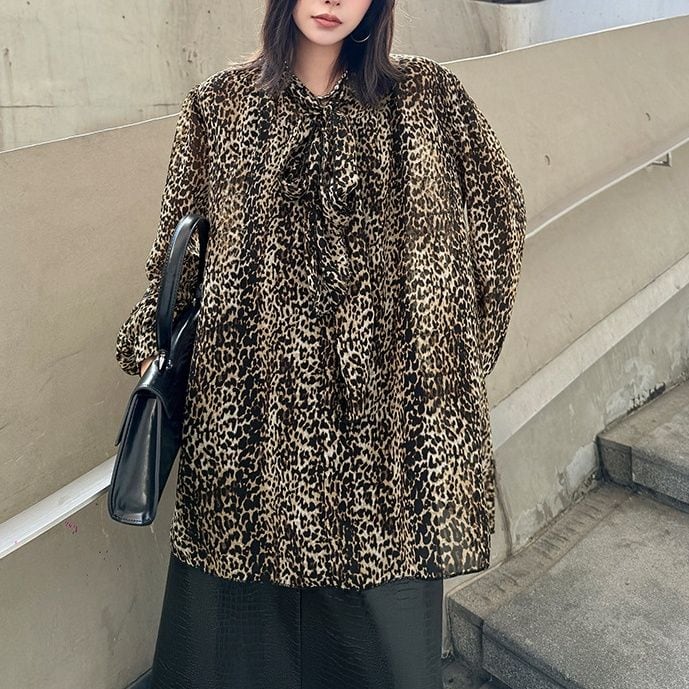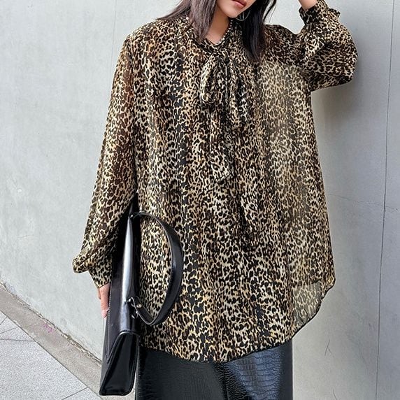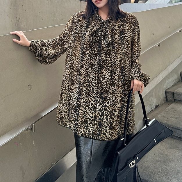 LEOPARD OVERSIZED LONG SLEEVES BOW TIE SHIRT 1color M-15647