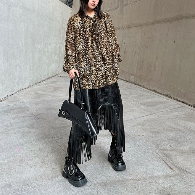 滑らかなシフォン素材でできた、ヒョウ柄のボウタイシャツブラウスです。ゆったりとしたワイド幅のシルエットのチュニック丈で、シンプルなボトムスとの相性がいい、エレガントな目を惹くアイテムです。