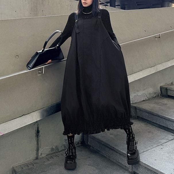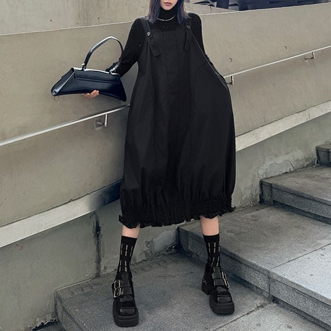 ブラックの無地素材でできた、ミドル丈のストラップ・ジャンパースカートです。ショルダーストラップはボタンで長さを調節できます。シャーリングで作られた裾のラインがキュートな、何にでも合わせやすいカジュアルアイテムです。