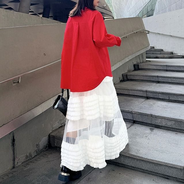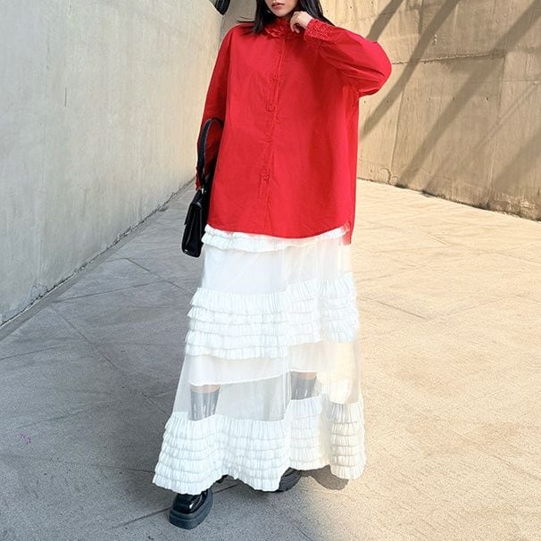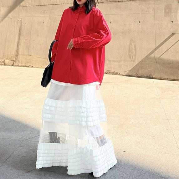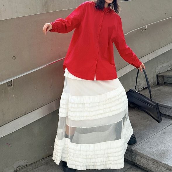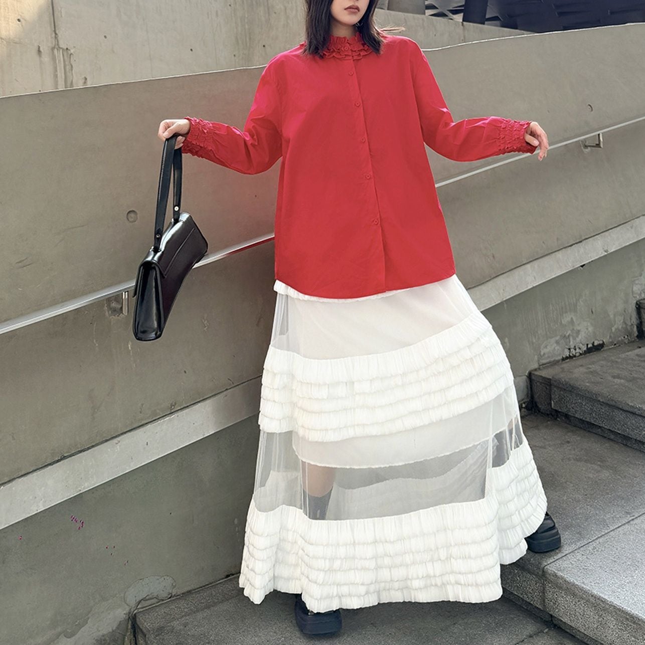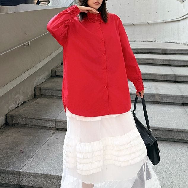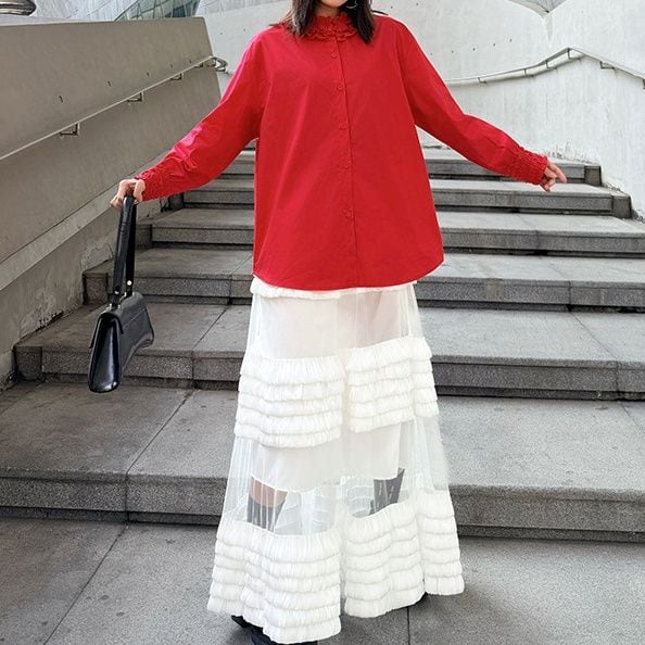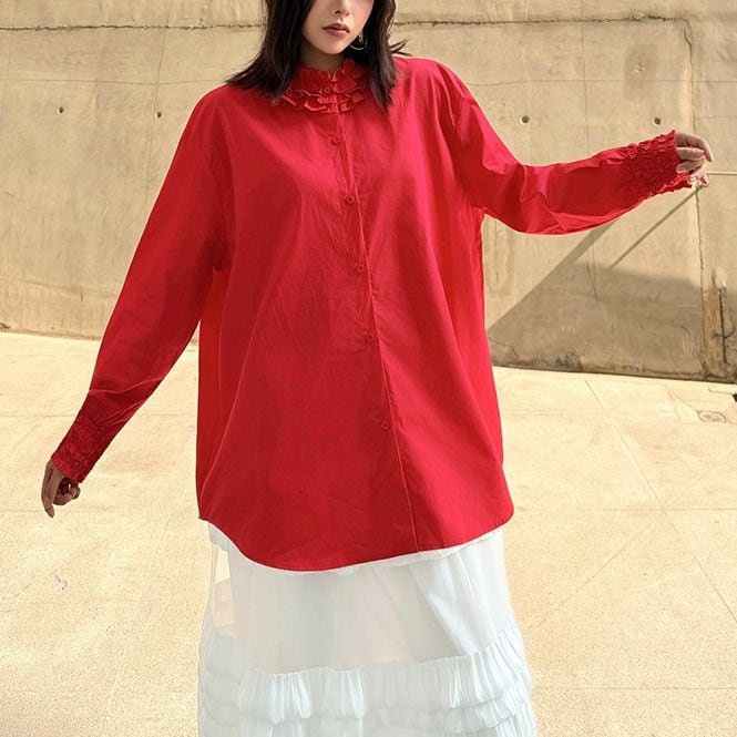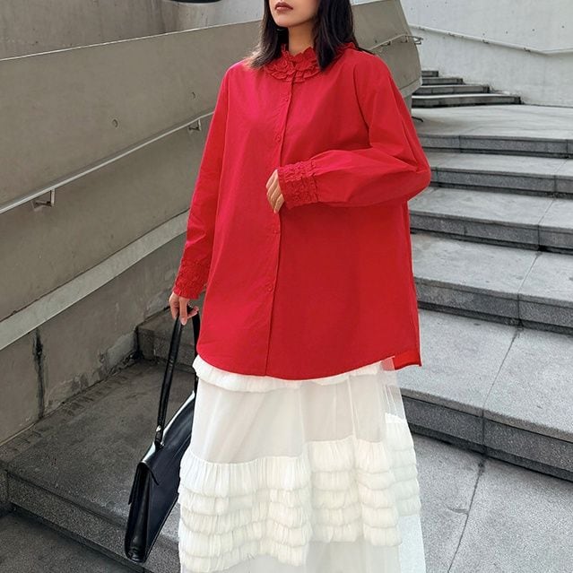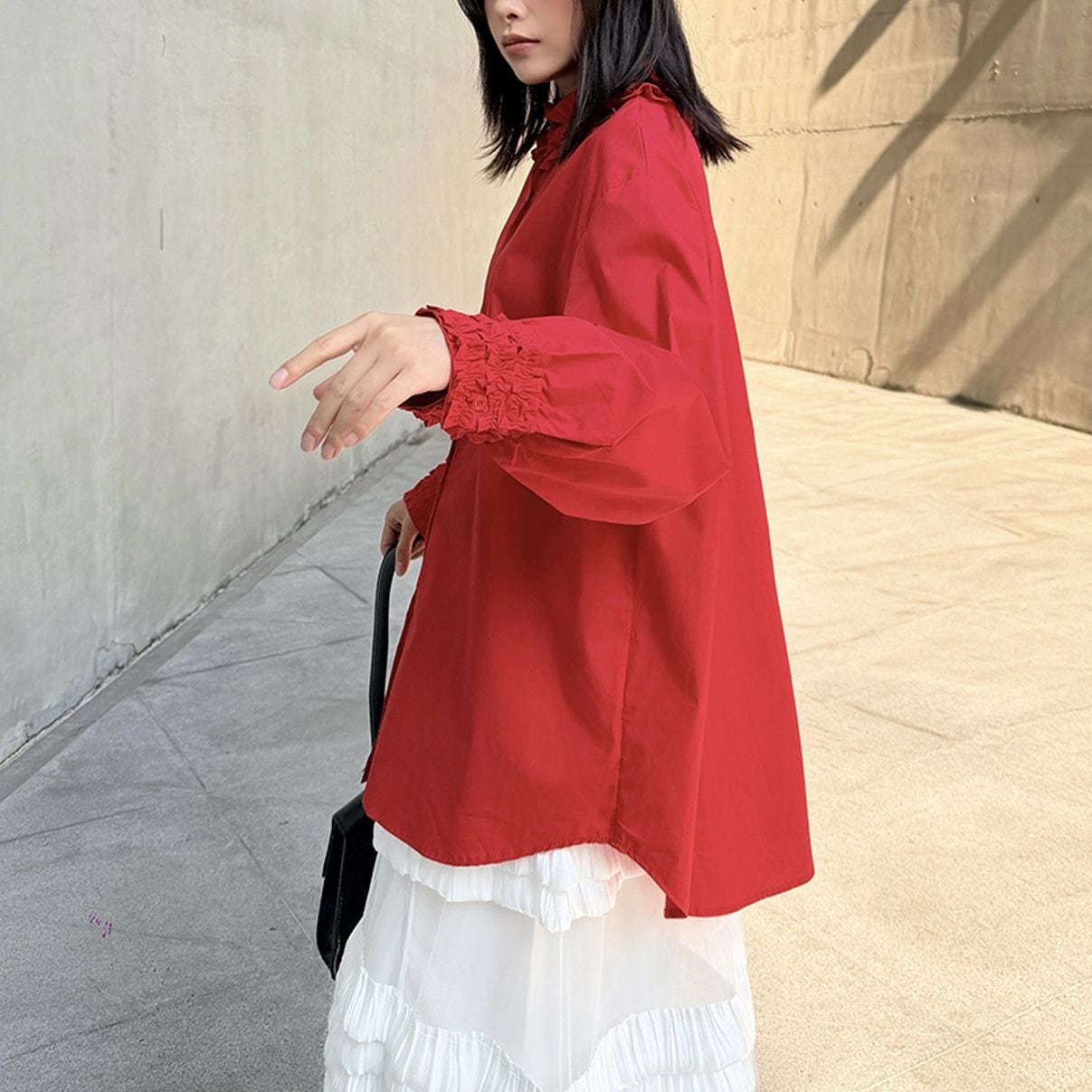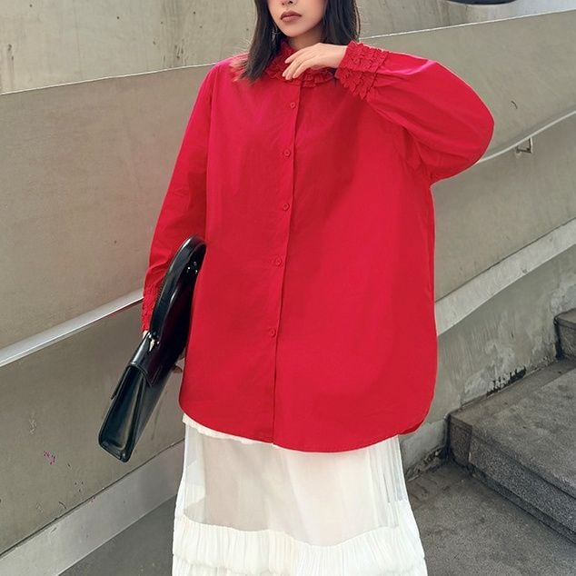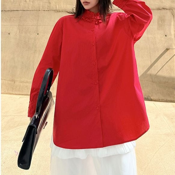 ネックや袖口の小さなフリル飾りがキュートな、フリルスタンドカラー・長袖・ラウンドカットの単色シャツです。ゆったりとしたシルエットのシンプルなデザインで、コーディネートしやすいアイテムです。レッドとブラックの2色から選べます。