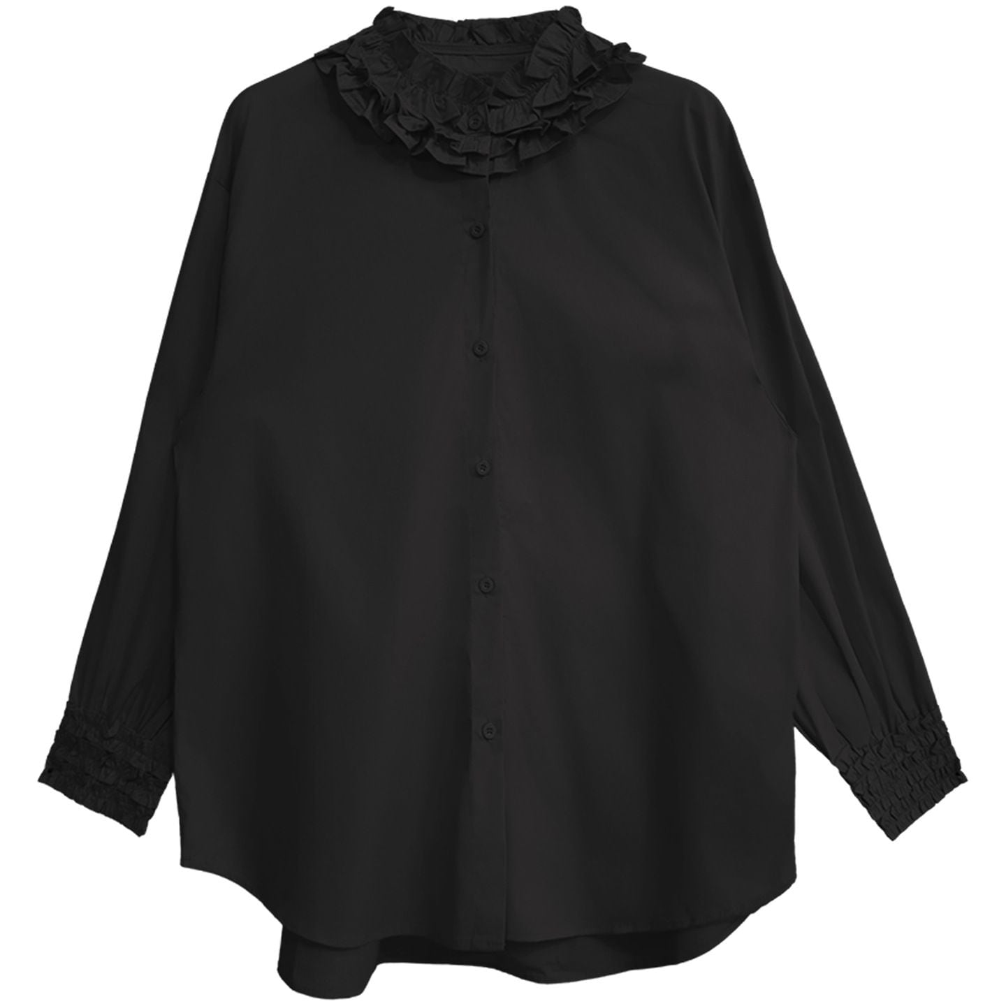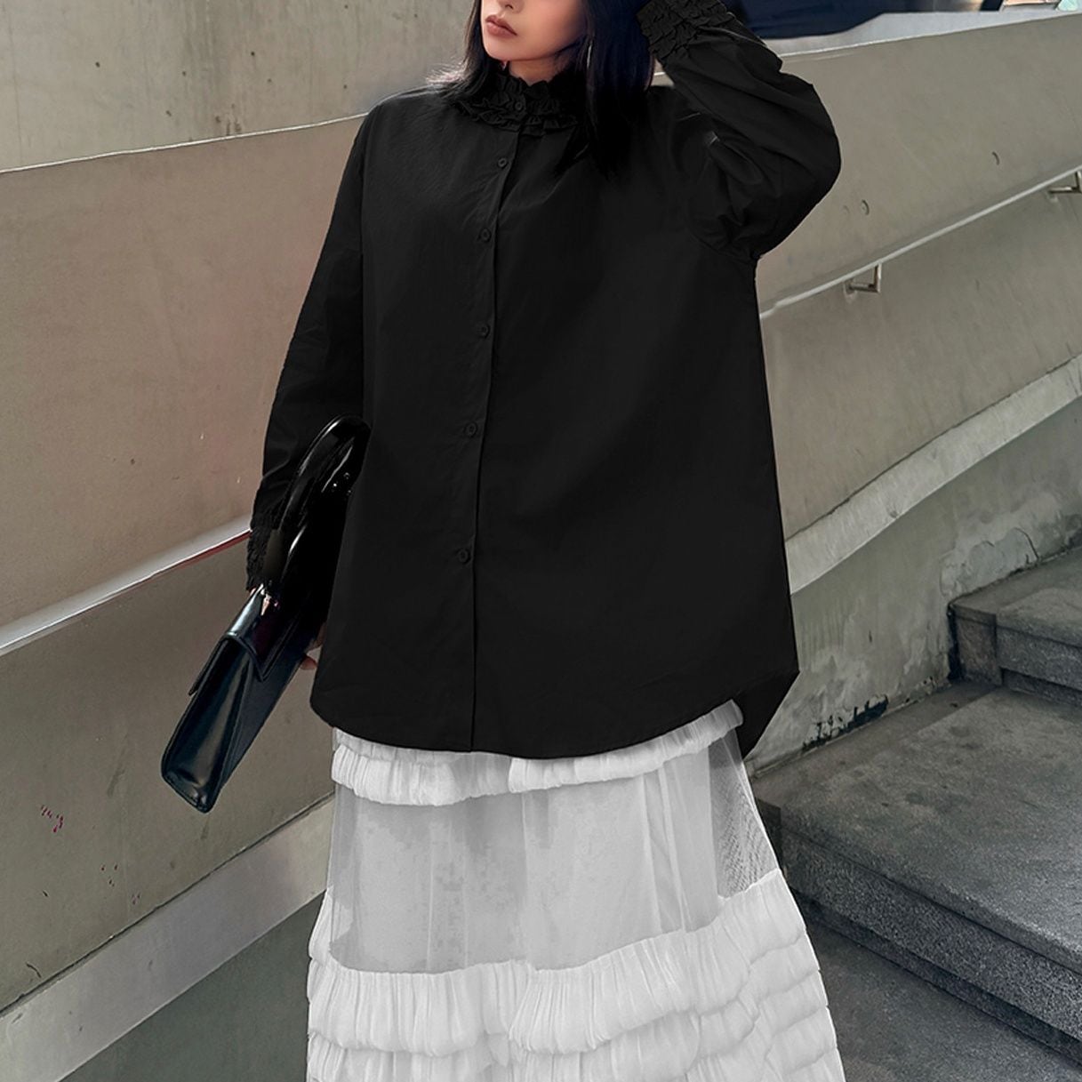 SOLID FRILLED STAND COLLAR LONG SLEEVES SHIRT 2colors M-15650