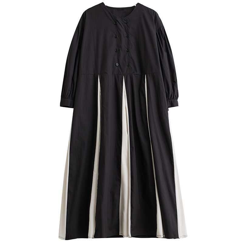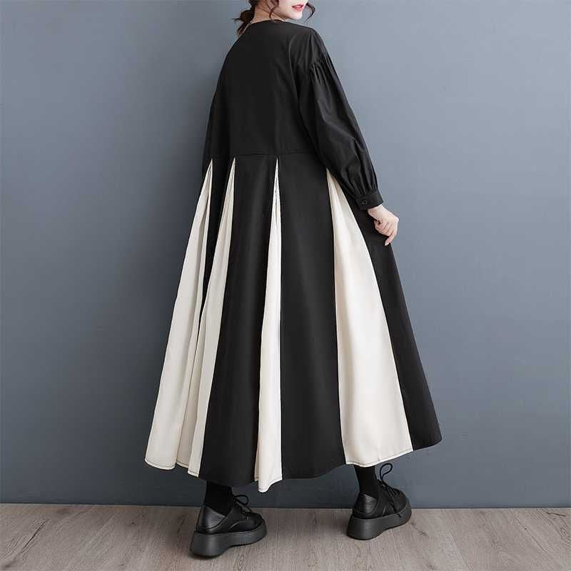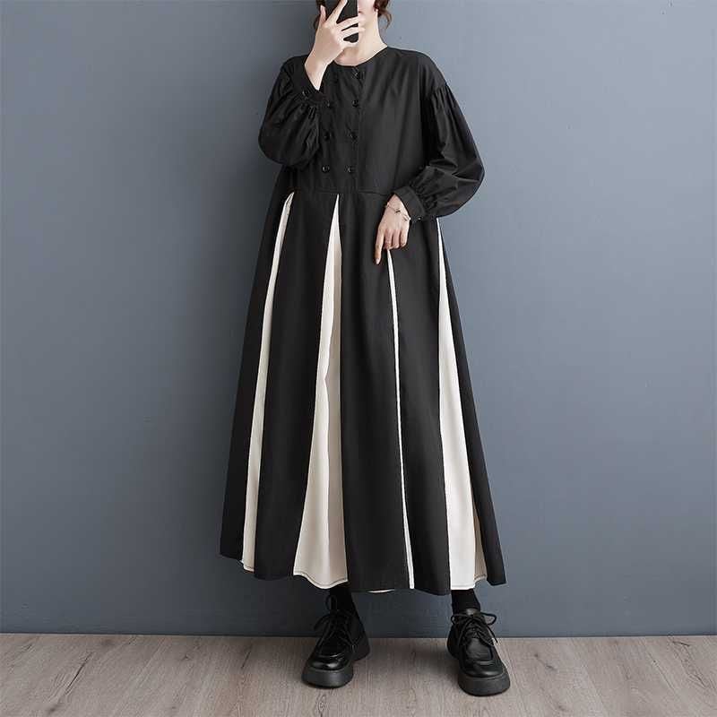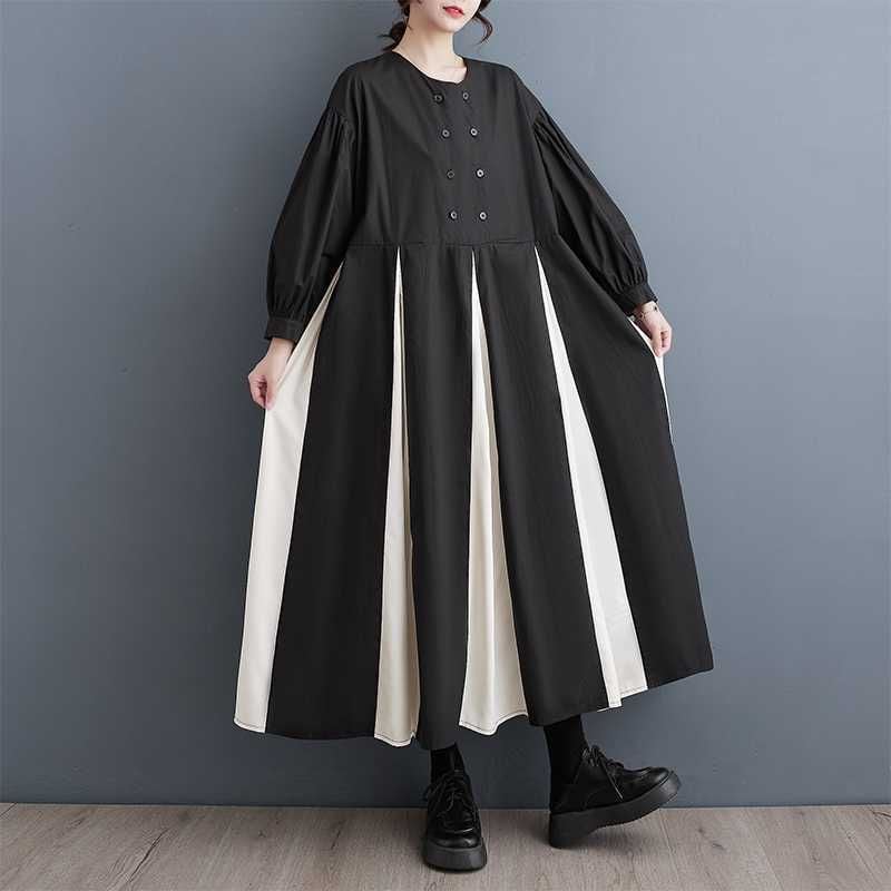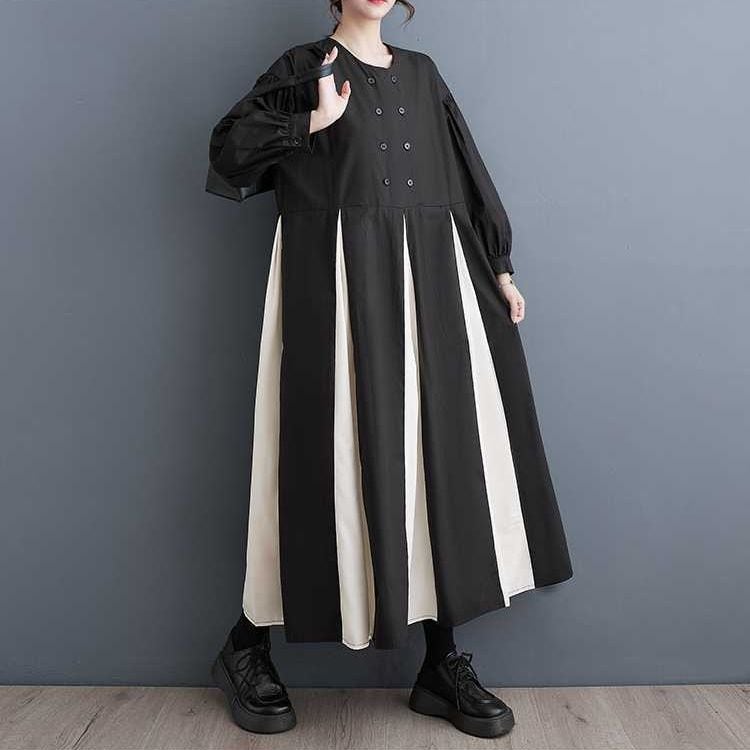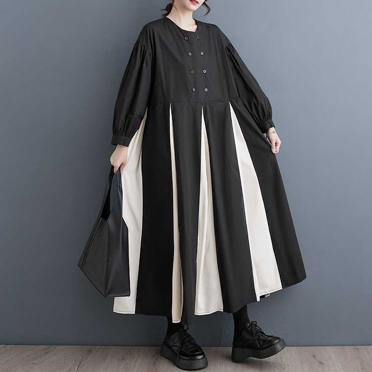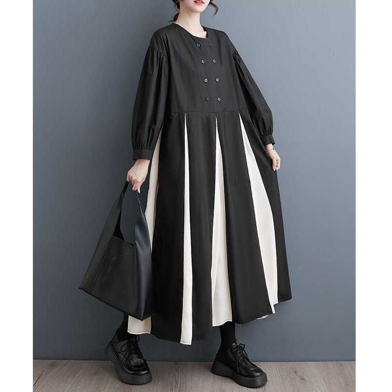 CONTRAST BOX PLEATS ROUND NECK A-LINE LONG SHIRT DRESS 1color M-15653