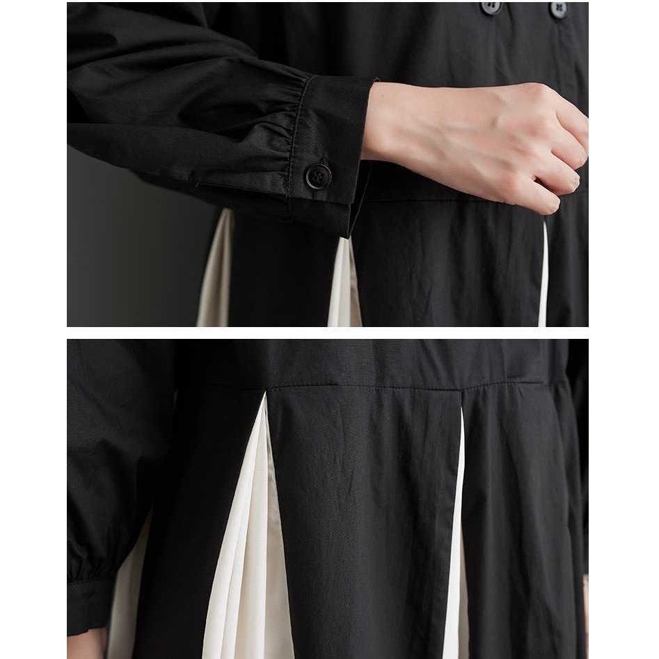 ブラックとホワイトのコントラストボックスプリーツがキュートな、ラウンドネック・長袖・ロング丈のシャツワンピースです。ダブルブレストのハーフボタンに大きく広がるAラインのシルエットが美しい、エレガントで目を惹くアイテムです。