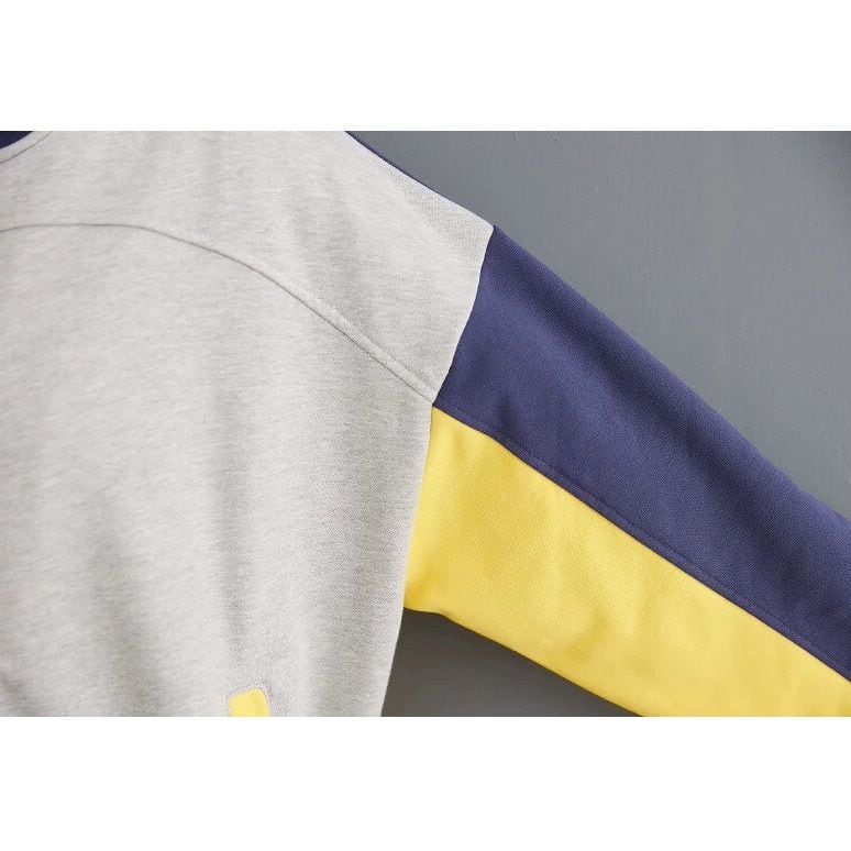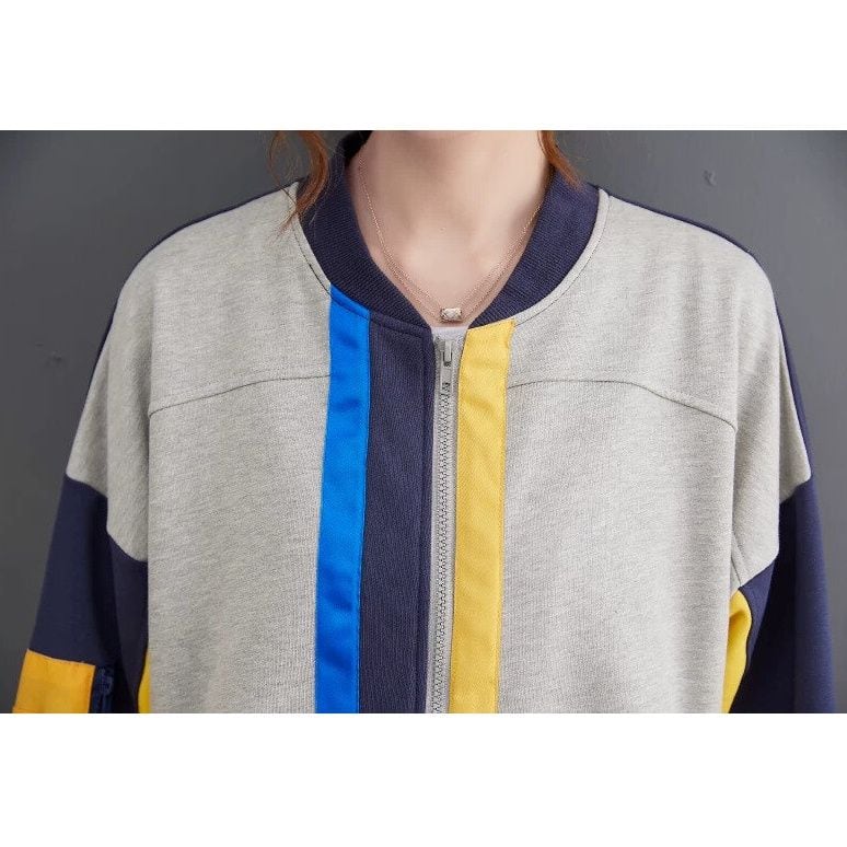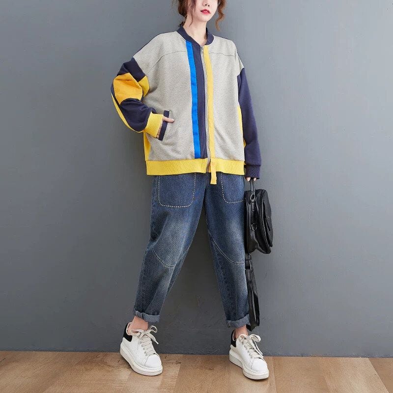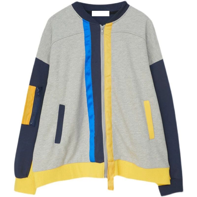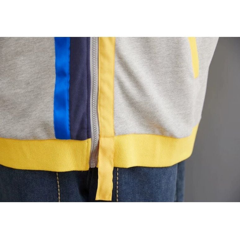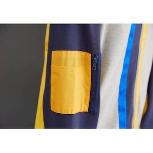 ネイビー・イエロー・グレー・ブルーのカラーブロックデザインがキュートな、ベースボールカラーのフルジップジャケットです。裾より長いイエローのラインスティッチがアクセントになった、ゆったりとしたシルエットで着心地の良いカジュアルアイテムです。