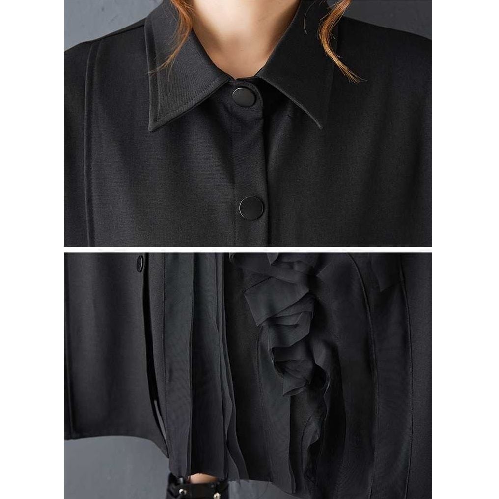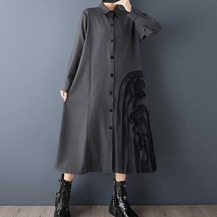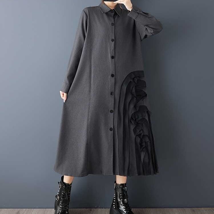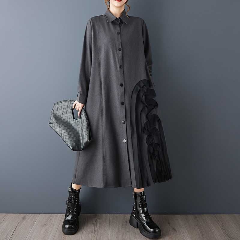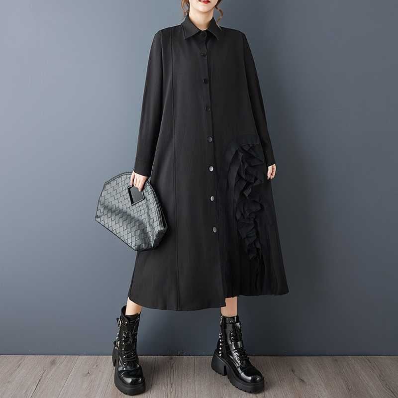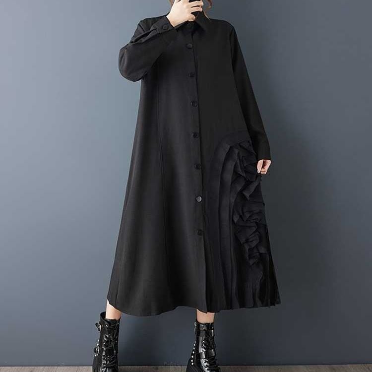 透け感のある素材であしらわれた立体的なモチーフがアーティスティックな、ポロ襟・長袖・膝下丈のシャツワンピースです。上品なAラインのシルエットに落ち着いた色味の単色が、クラシカルな雰囲気のアイテムです。ブラックとグレーの2色から選べます。